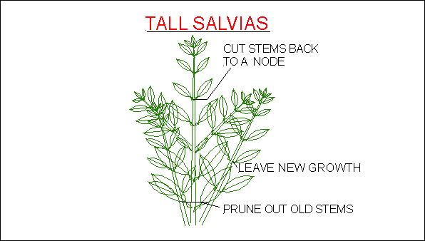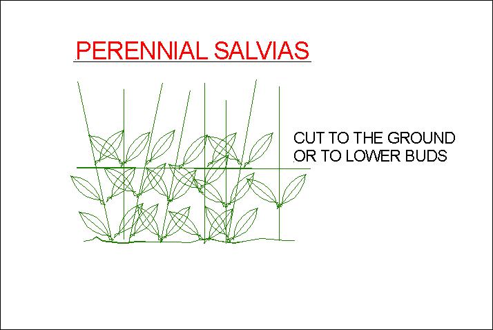 Perennial Salvias These are usually plants with tall straight stems that come directly out of the ground, they produce new shoots at the base. These can be cut down to the ground, only after new shoots have appeared. These plants don’t need touching again until late Summer coming into Autumn, when they need cutting down again.
