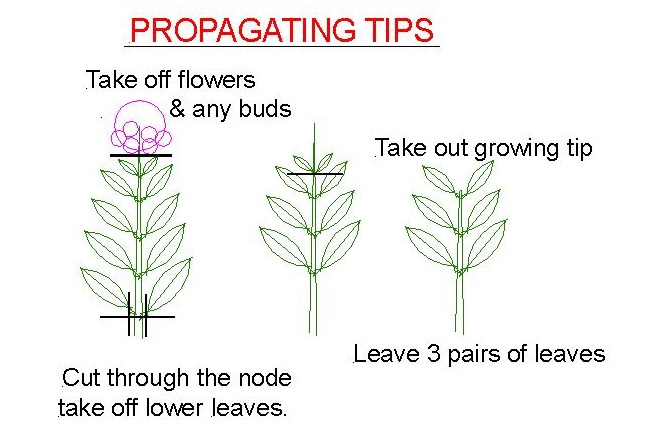 Take a cutting approx 10-12cm from the tip, strip the bottom leaves, remove any flower buds and remove the growing tip. This will encourage new shoots, encouraging the plant to become bushy. On large leaf varieties, cut the leaf in half ( again so they don’t transpire too much)
