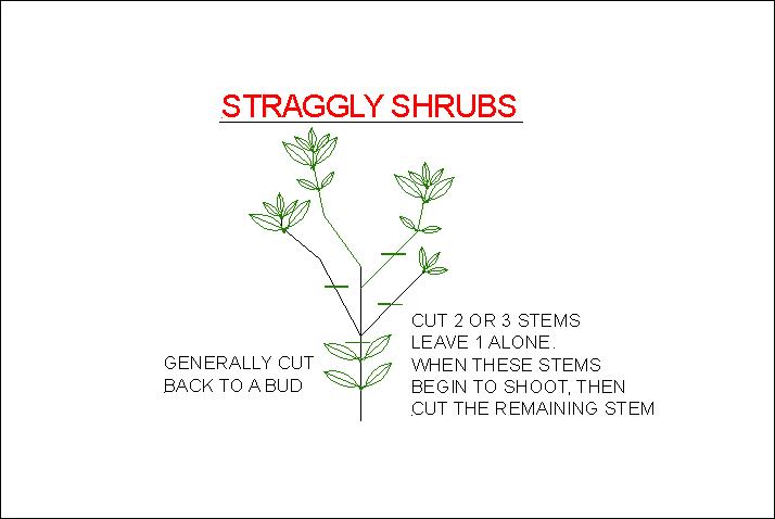 If the plant is straggly and has about 2 or 3 stems, cut 2 stems back to lower nodes and leave the other one. Wait until the stems begin to shoot before cutting down that last straggly stem. Often if you cut all the stems down all at once – especially if too severely, then the plant can go into shock and die.!. This method ensures that you don’t loose your plant when pruned.