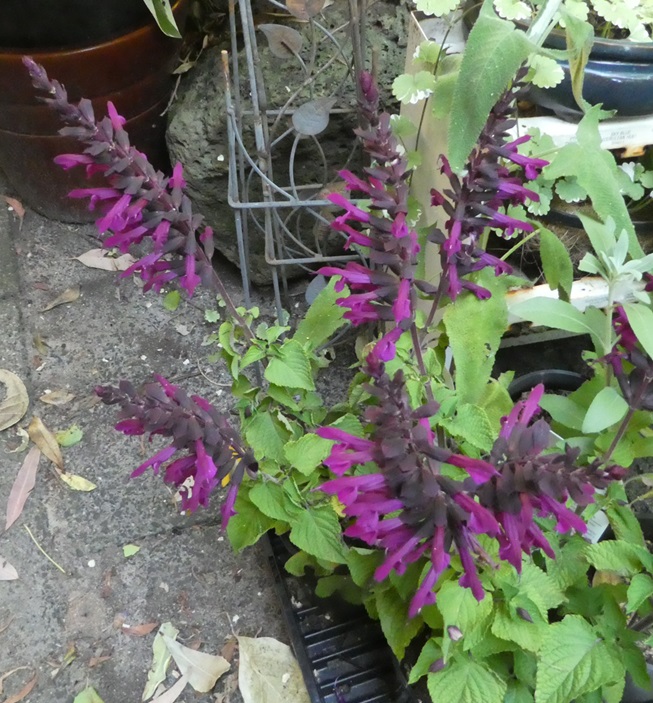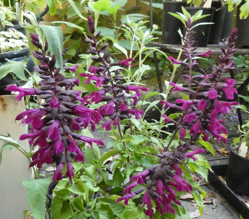 Salvia ‘Unplugged Pink’ has a multiple combination gene pool of various Salvias. The most evident is S. guaranitica, which shows by the flower spikes all facing outwards in the one direction and S. splendens showing in the calyces.