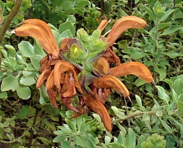 Salvia aurea; is a hardy shrub 1.2- 1.5mH, Tough hardy for hot dry summers, winter cold and tolerates frost. Terracotta flowers appear in spring. Clips very well into a ball or hedge.