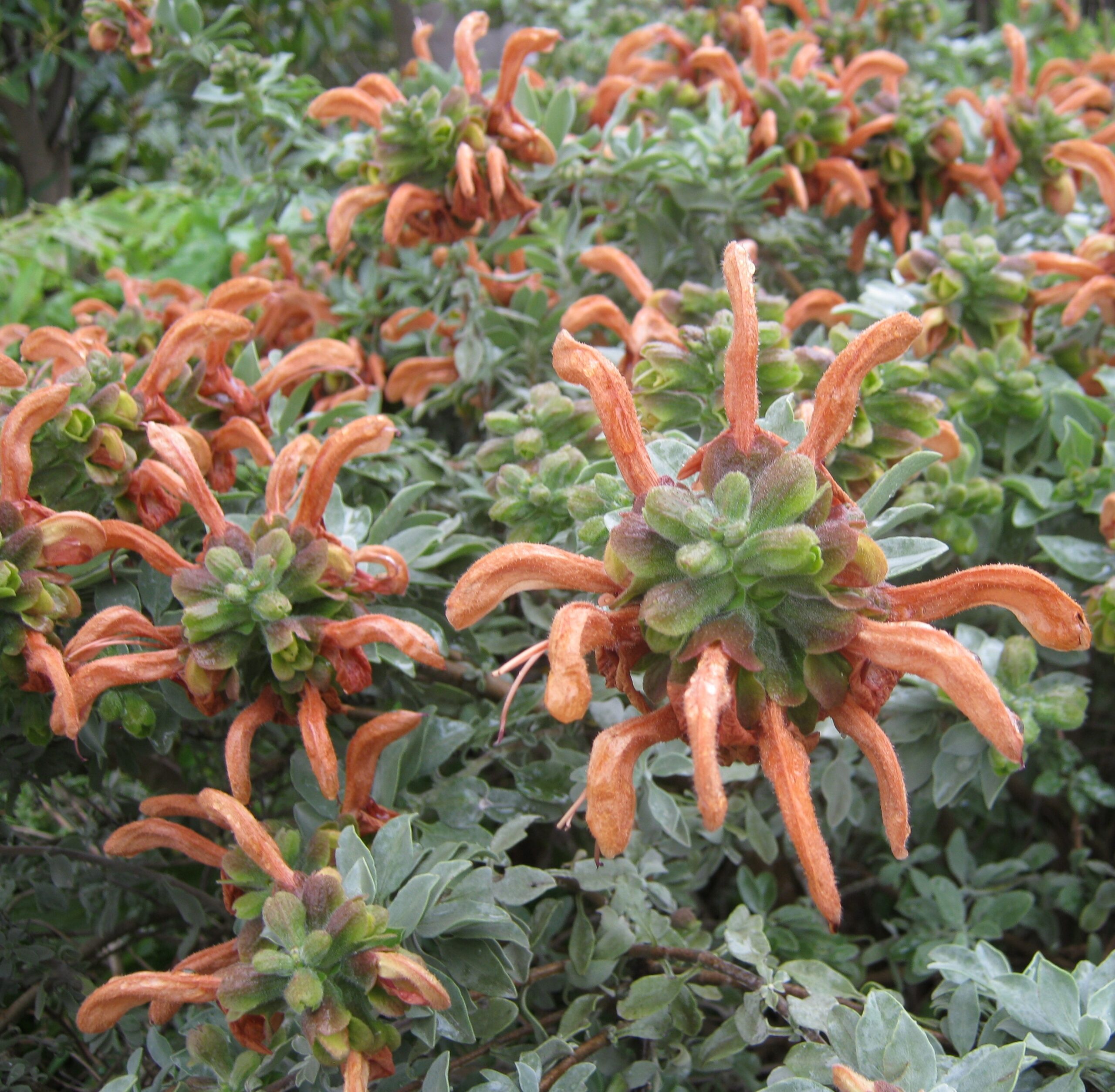 S. aurea ‘Silver Lady’, (seed) a bushy shrub to 1.2m H with silver leaves and terracotta flowers, in spring, very tough and hardy for summer and winter, frost tolerant.