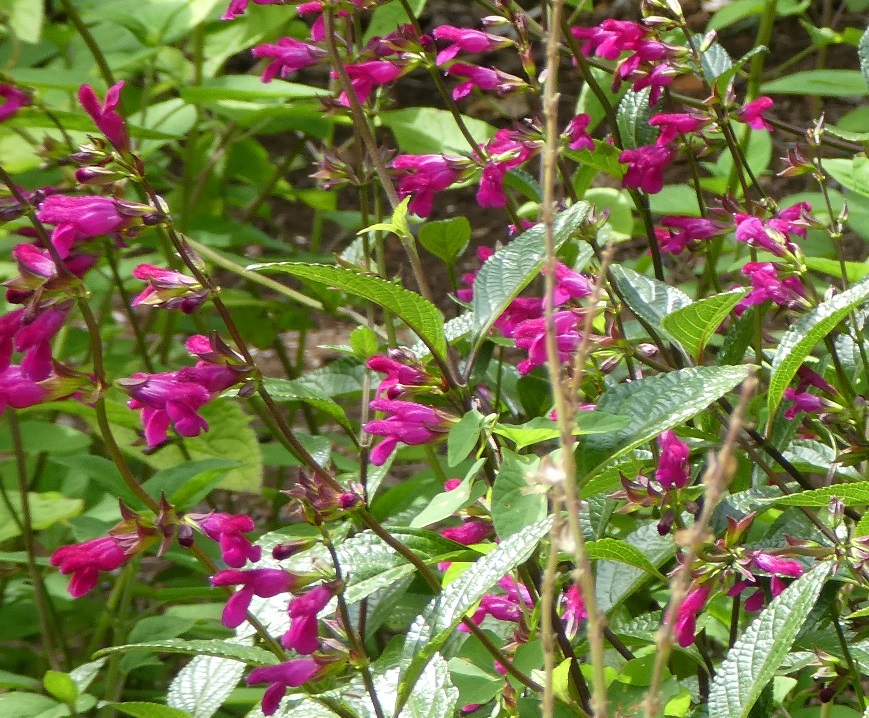 Salvia chiapensis is a small bushy tropical looking shrub 1mH with cerise flowers that flowers all year. Perfect for dappled sun /shade. Easy to grow.