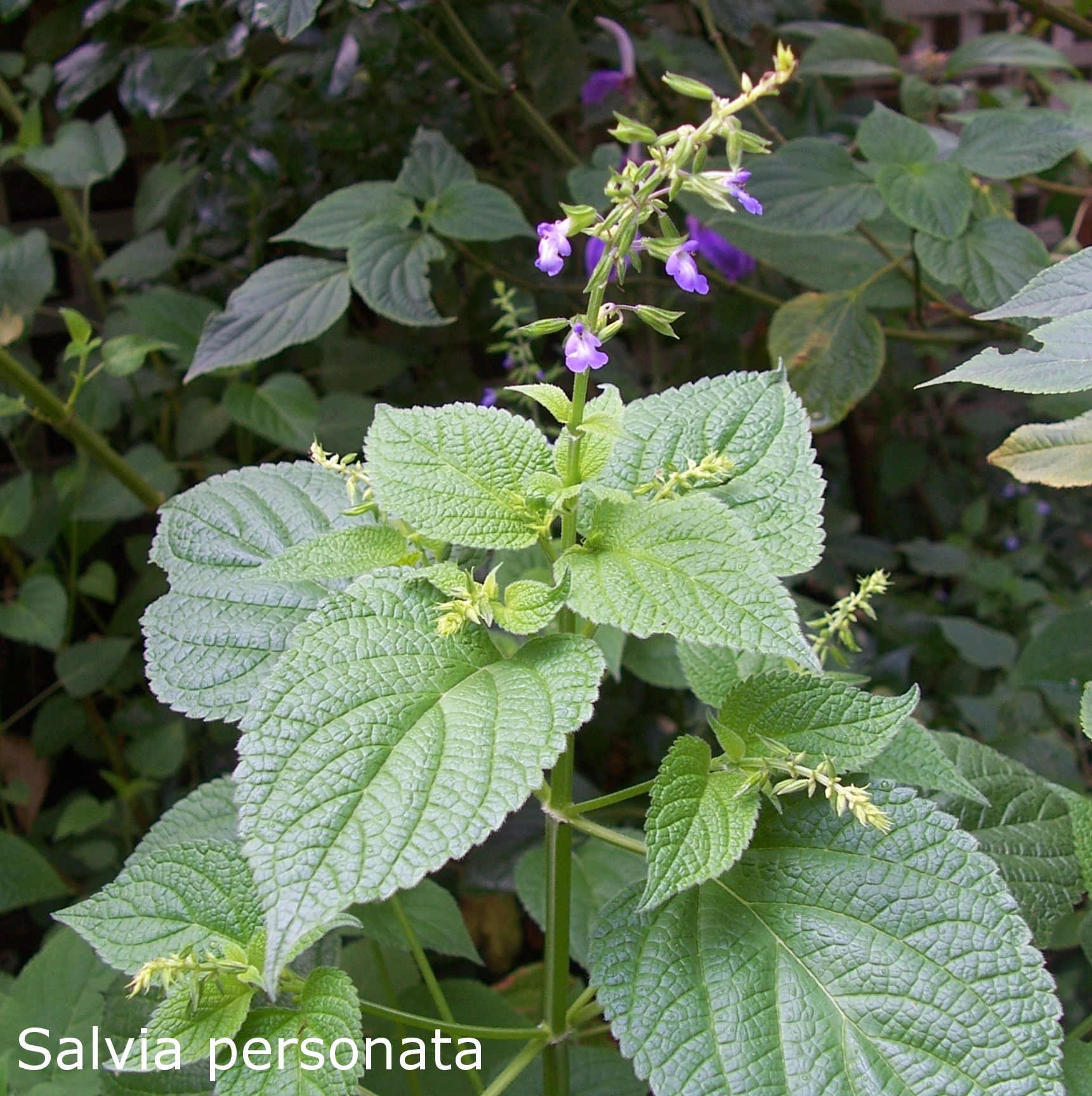 S. personata: An upright bushy annual to 1mH with large leaves and masses of pale blue flowers in Spring. A good large leaf filler.