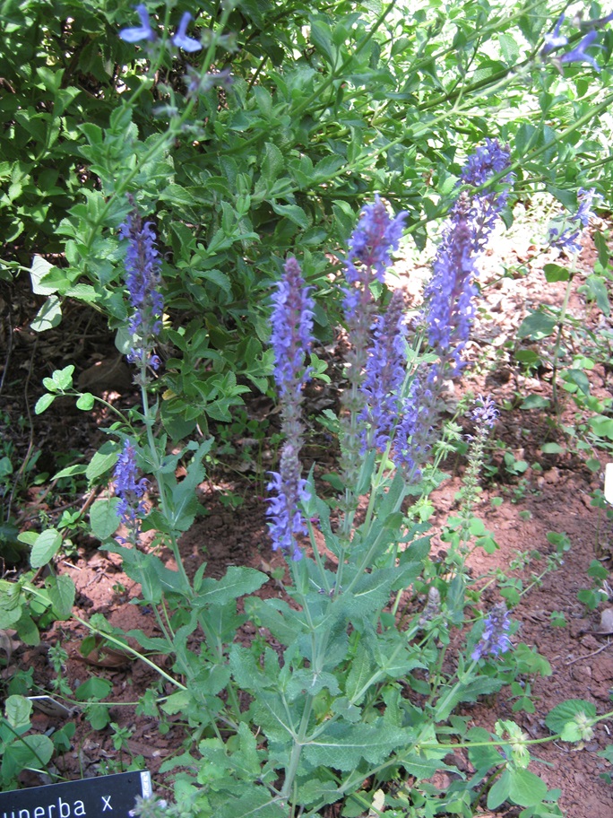 Salvia superba x ‘Blue Queen‘: a small clumping herbaceous Salvia 40cmH with small leaves and spires of blue flowers in late spring and summer.