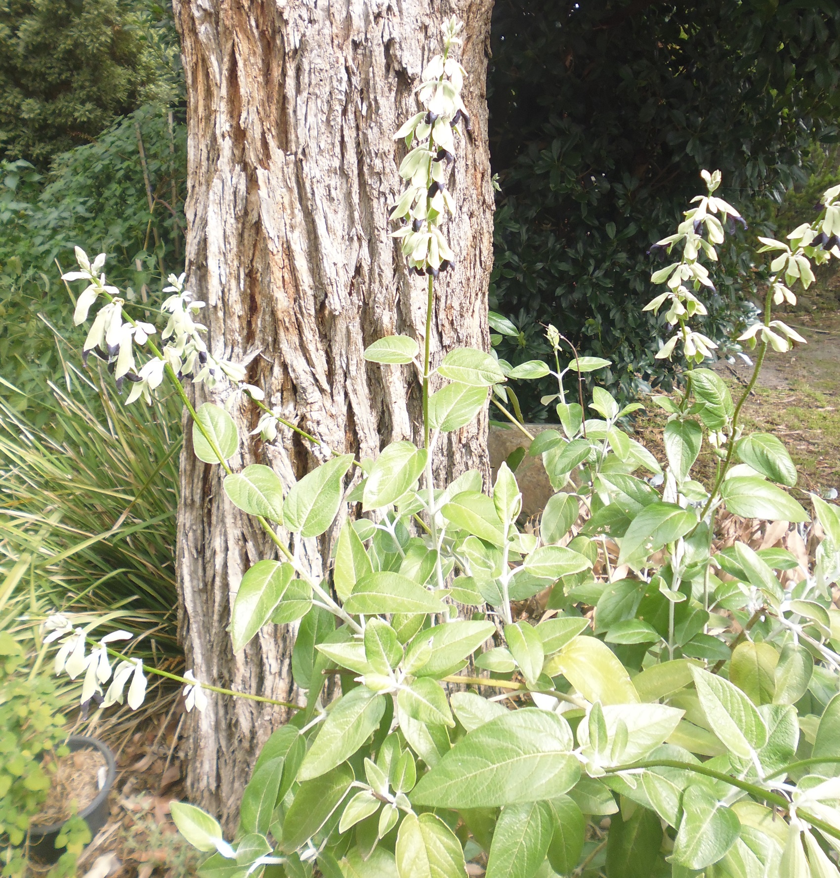 Salvia discolor : a small shrub 1mH with silvery stems, olive leaves and black flowers, most of the year. Plant in a sunny position.