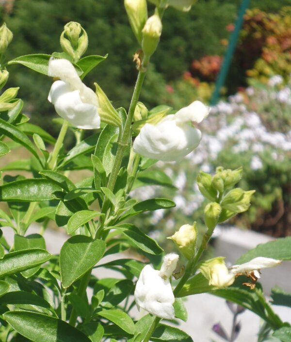 Salvia greggii ‘Alba’; a small bushy shrub 60cmH with white flowers most of the year. grow in full sun in a mixed border.