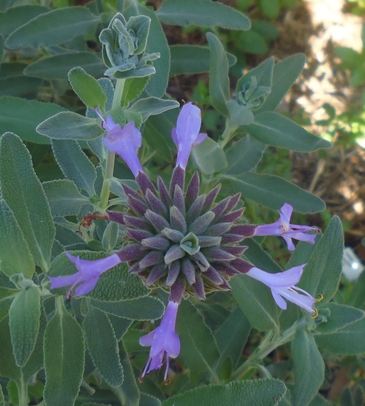 Flowers: are sky blue, in layered whorls around the stem. The stamens are exerted, showing the parentage of S. clevelandii.