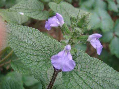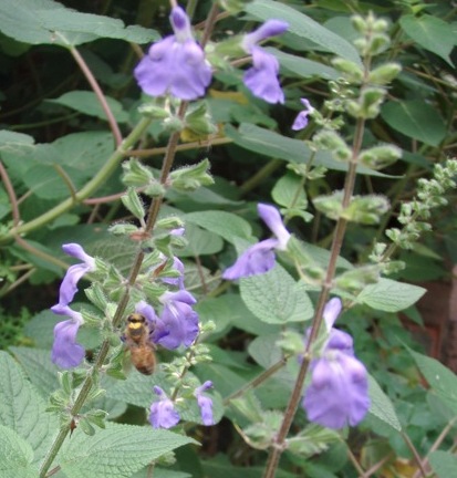 Flowers: are a mid blue with a hint of mauve and semi tubular. Hoods are blue / mauve at the tip, the throat and base of the hood are white. The bottom lobe is large, fanning out , acting as a landing strip for bees. Flowers are held in numerous whorls of 3 or 4 around a green stem, which is held high above the foliage to grab passing insects. Flowering is quite prolific, beginning in late summer through autumn and into winter.