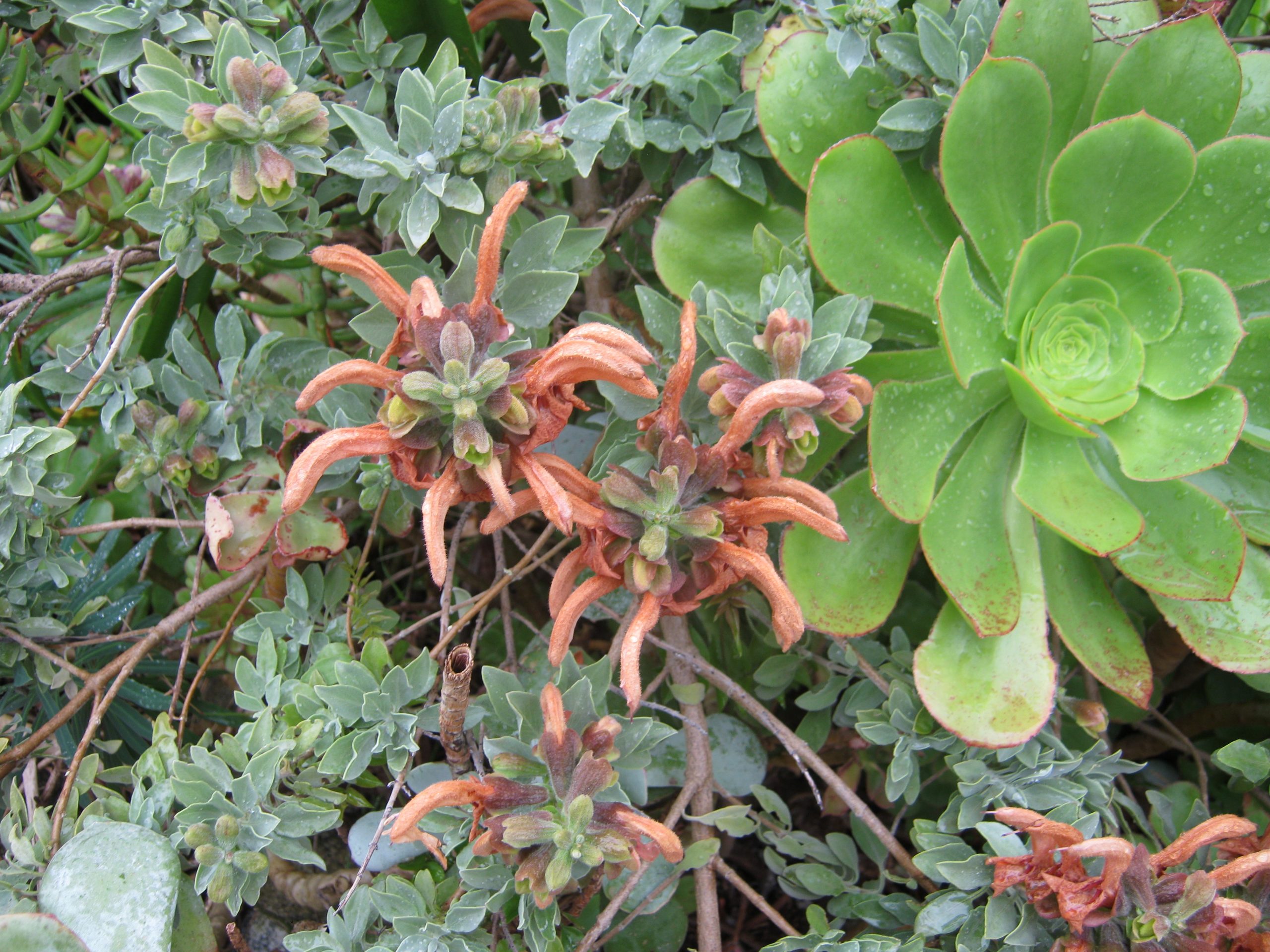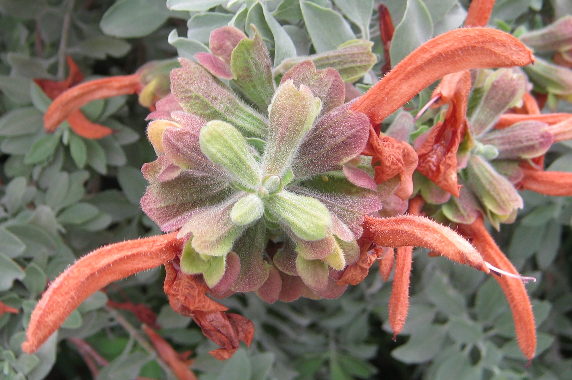 Flowers: are slightly smaller than the parent with a different  hue of terracotta. Hoods are long and the bottom lips are well marked. The calyx is vase shaped, with some colouring at the ends.