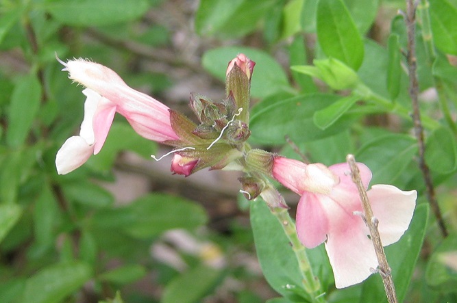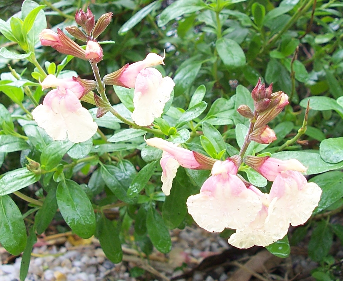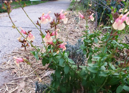 Salvia bicolor ( greggii): is a small open subshrub 60cmH. Tough and hardy for a sunny position with cream and pink flowers for most of the year.