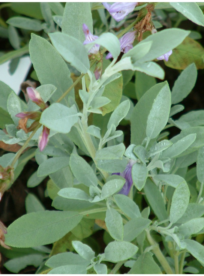 Leaves: are green with a grey blue tinge, lanceolate with a blunt pointed apex and rugosely textured with very fine crenations along the edges. They have a mild “sagey” fragrance, to ward off foraging animals and insects. Leaves can also be used in cooking.