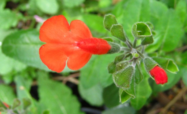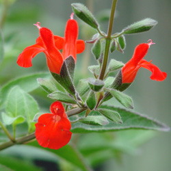Flowers: are a large bright vermilion colour. The hood is small and furry, the bottom lobes are large and folded down to allow small birds and bees to enter into the flower. The flowering stems can be 15-20cmlong. Flowers appear in small whorls of 4-6 flowers along a dark brown stem. These are held well above the foliage to attract passing insects.