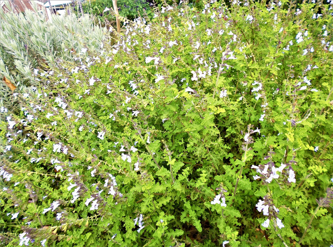 Leaves: are bright green, small and beautifully lobed. Each lobe is separated well before the next. The texture is rough with a blunt apex. The leaves have a pleasing aroma which is pleasant when brushing past the shrub.
