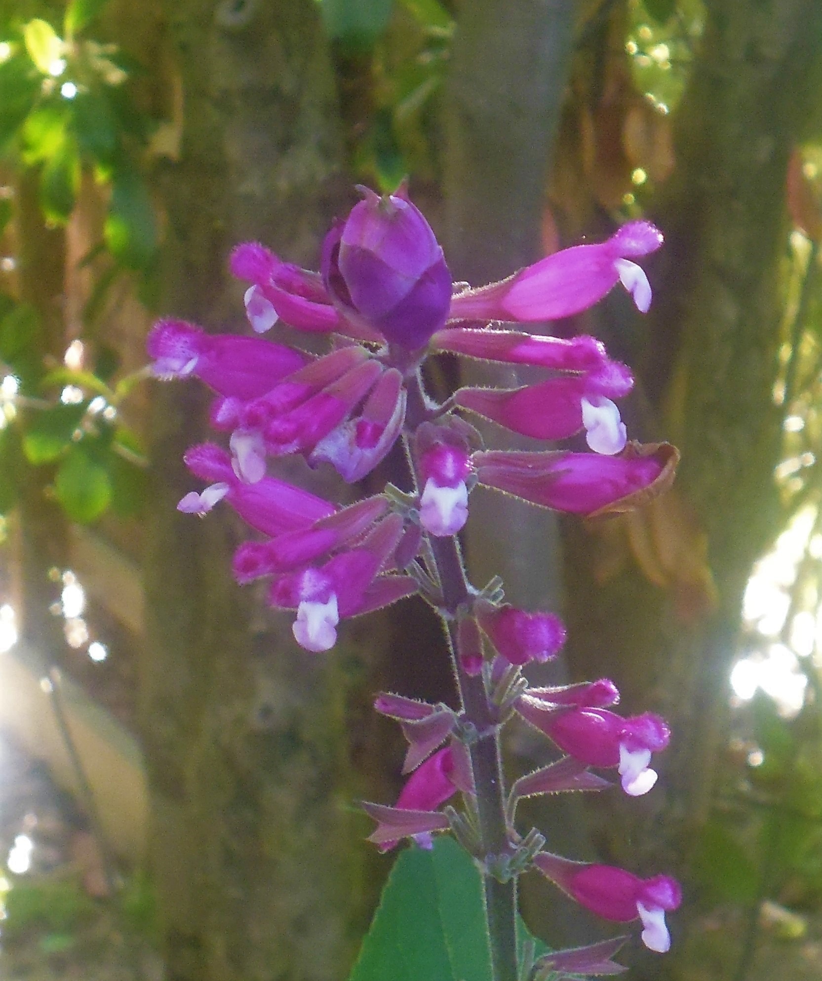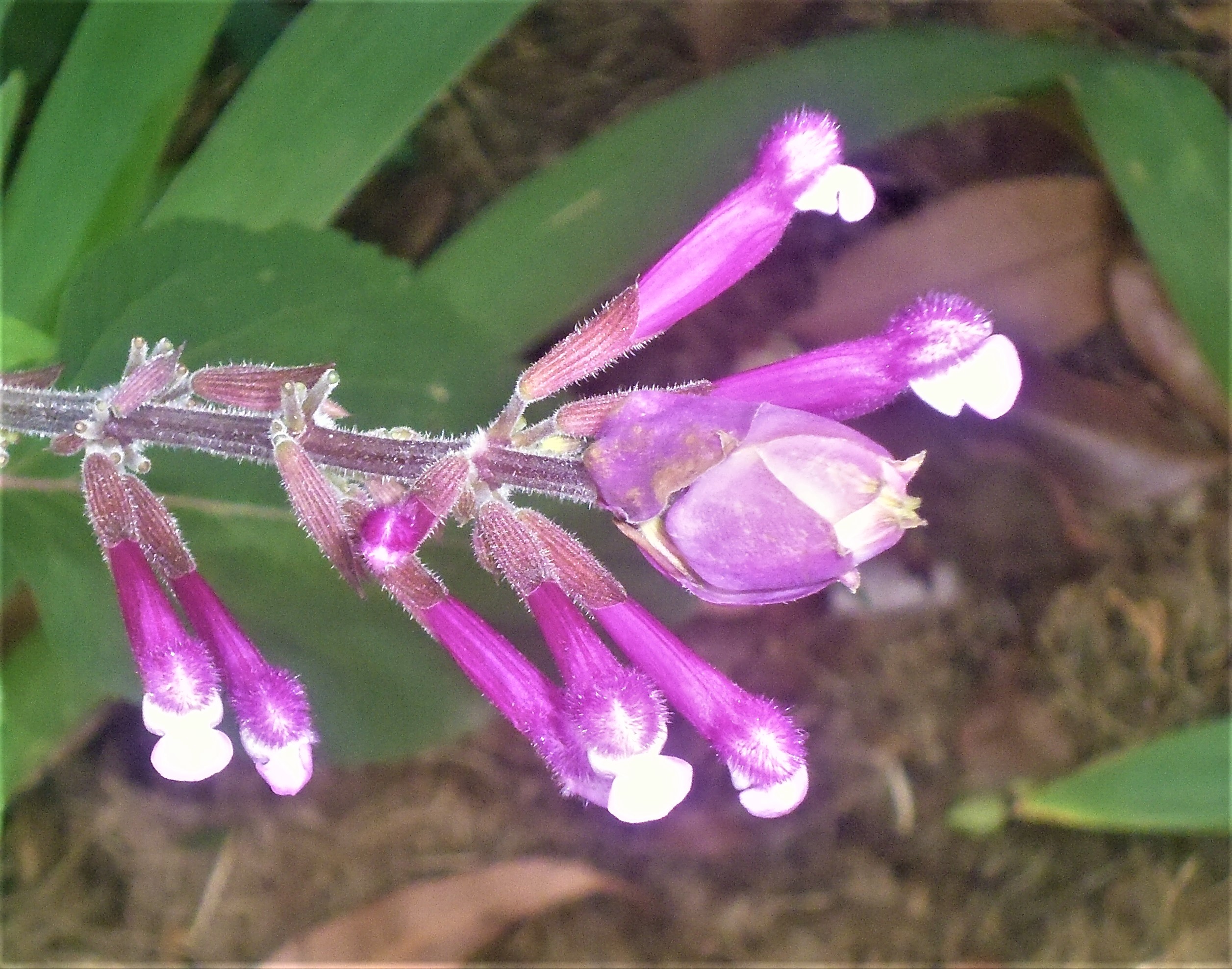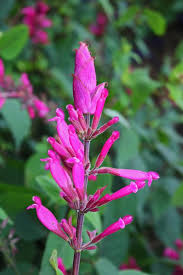 Flowers: are tubular, a clear cerise colour with a small hood and bottom lobe. The furry hood has a white tip to match the white bottom lobes. The white of the bottom lobe is the beeline or marker to attract insects and birds to the flowers, especially if grown in the shade.