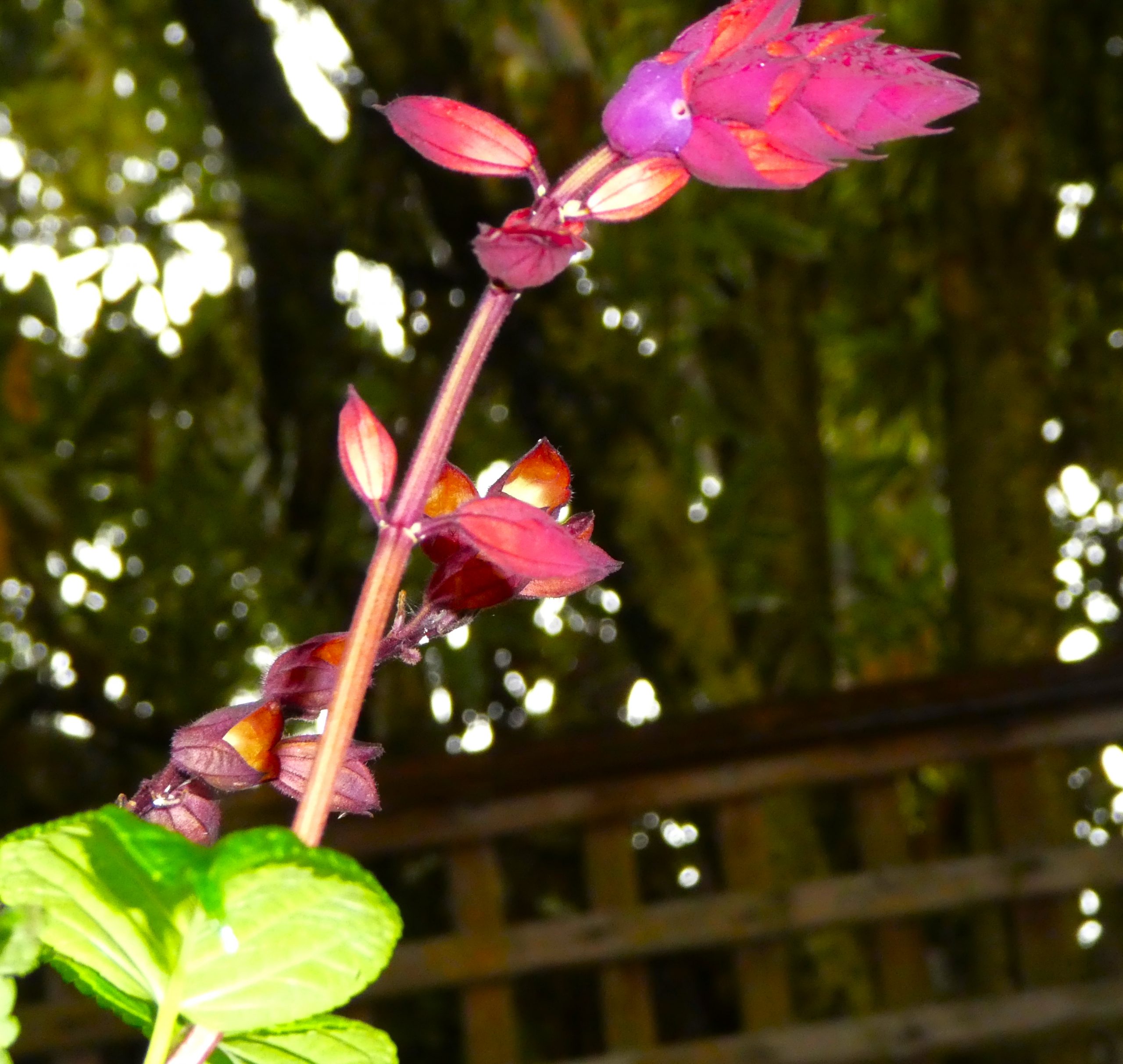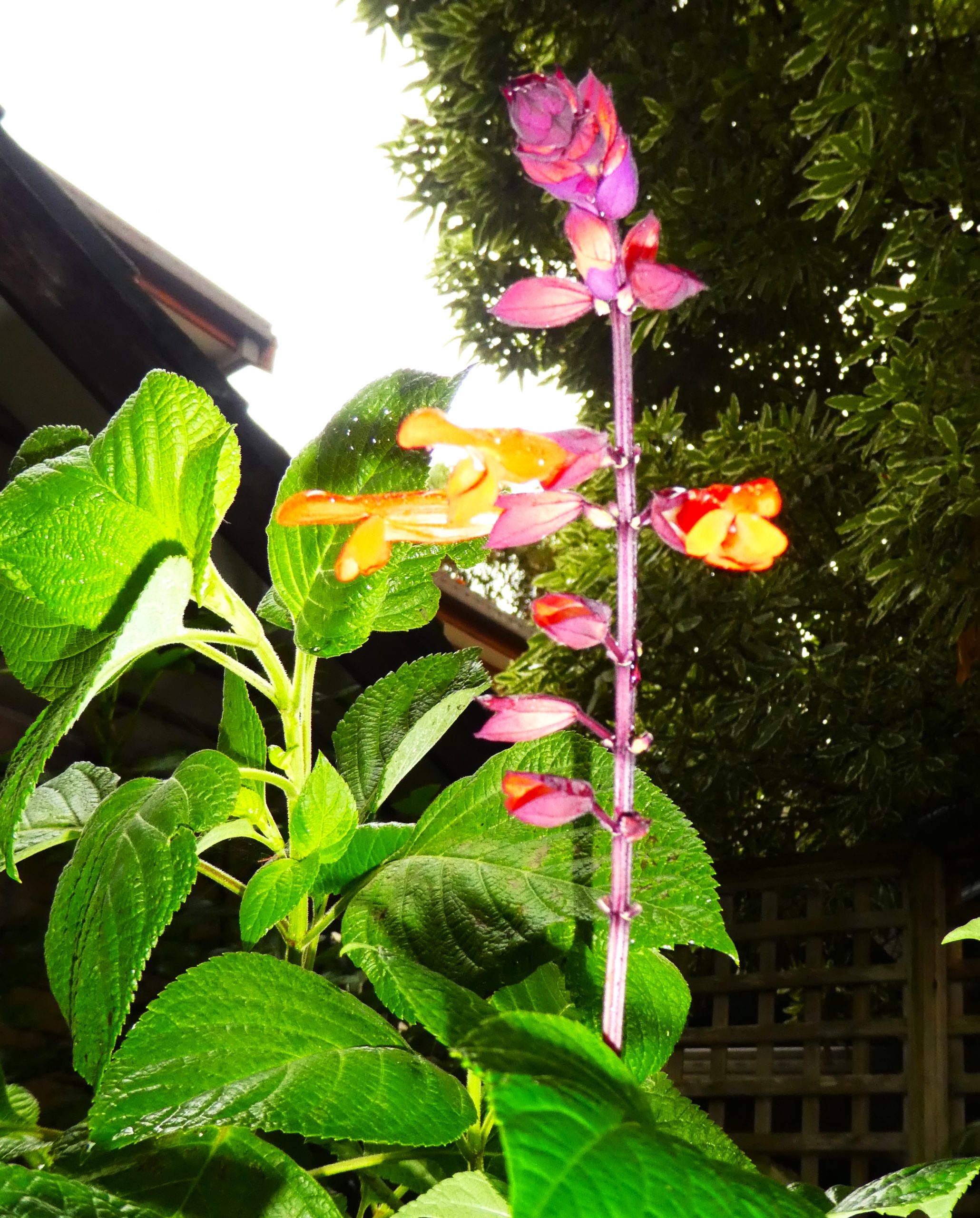 Salvia ‘Brittany’: is stunning when in flower with all the shades of pink and cerise in the calyces and the vermillion/ orange flowers, making a wonderful contrast with the bright green large leaves.