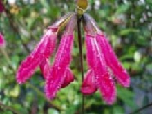 Flowers: are a wonderful magenta colour with a very long tubular flower, often know as the ‘Velvet Slipper’. The hood is long and hairy with masses of magenta hairs and the lower lobes are exerted and folded back like a slipper. These appear in spring through summer and into autumn. Very attractive to small honey eaters and bees crawling up the tube.