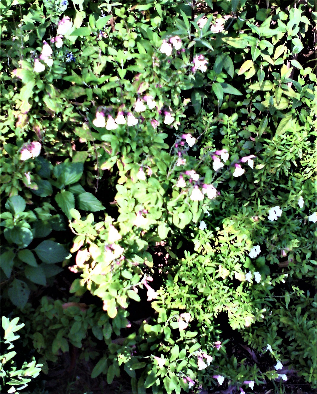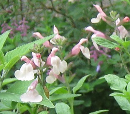 Salvia ‘Candleglow’ ( microphylla): is a small upright bushy shrub to 80 cm H with 2 toned flowers of cream and pink.