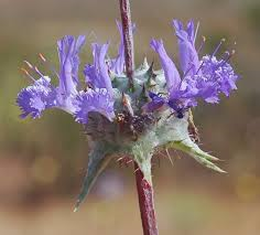 Flowers: are thistle like, small dense whorls of pale blue / lilac flowers of 6-8 flowers with exerted stamens. The stiff calyx structure is attached to a coloured rigid stem above the leaves. These are beautiful flowers with hoods that are upright and frilly, and the bottom lobe that is flares, split and frilly (to look like a thistle flower).