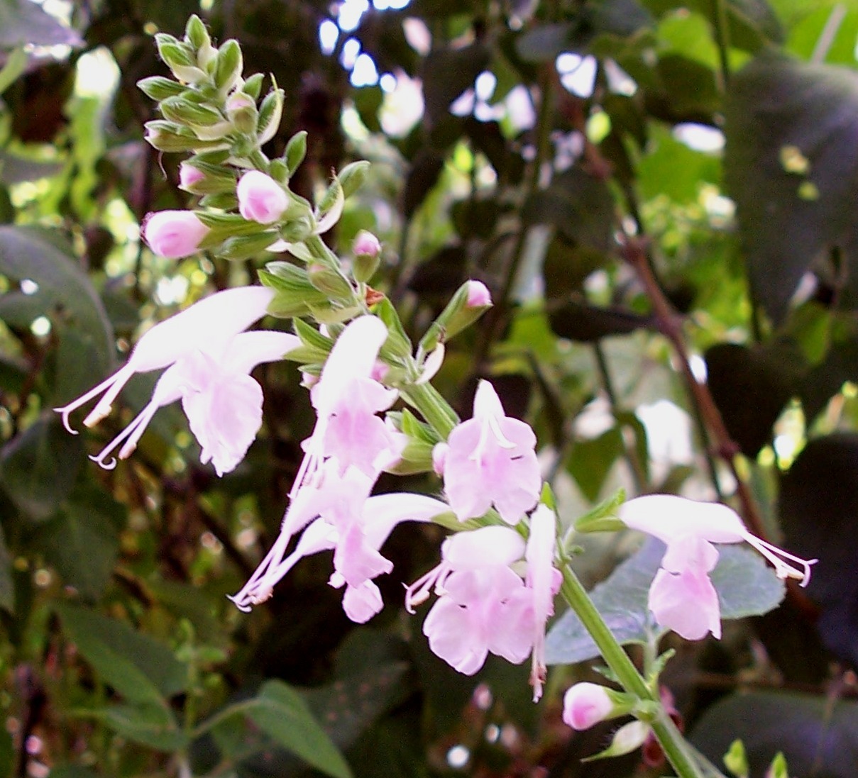 Flowers: are semi tubular, stamens exerted from the hood which is a soft pale pink almost white colour and the palest pink lower lobe. The bottom lobe is frilly, showing a prominent pink beeline in the centre to guide the bees and insects into the flowers.