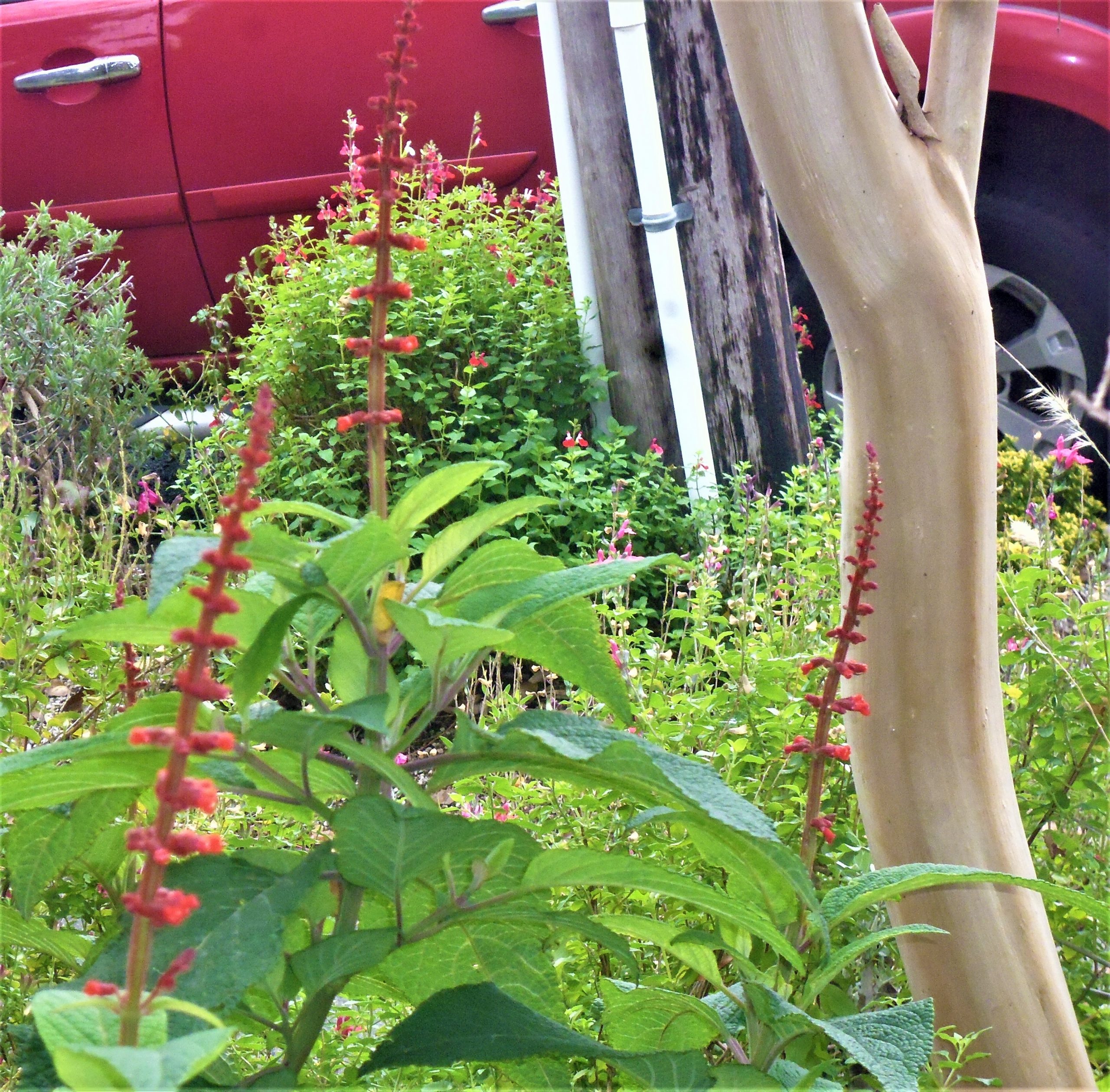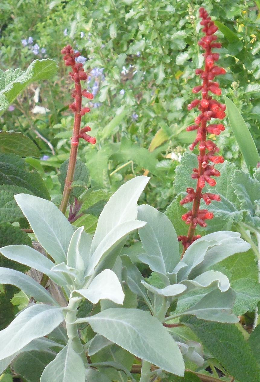 Salvia confertiflora: an upright shrub for full sun to 1.5-2m H with spikes of orange flowers in late winter / spring.