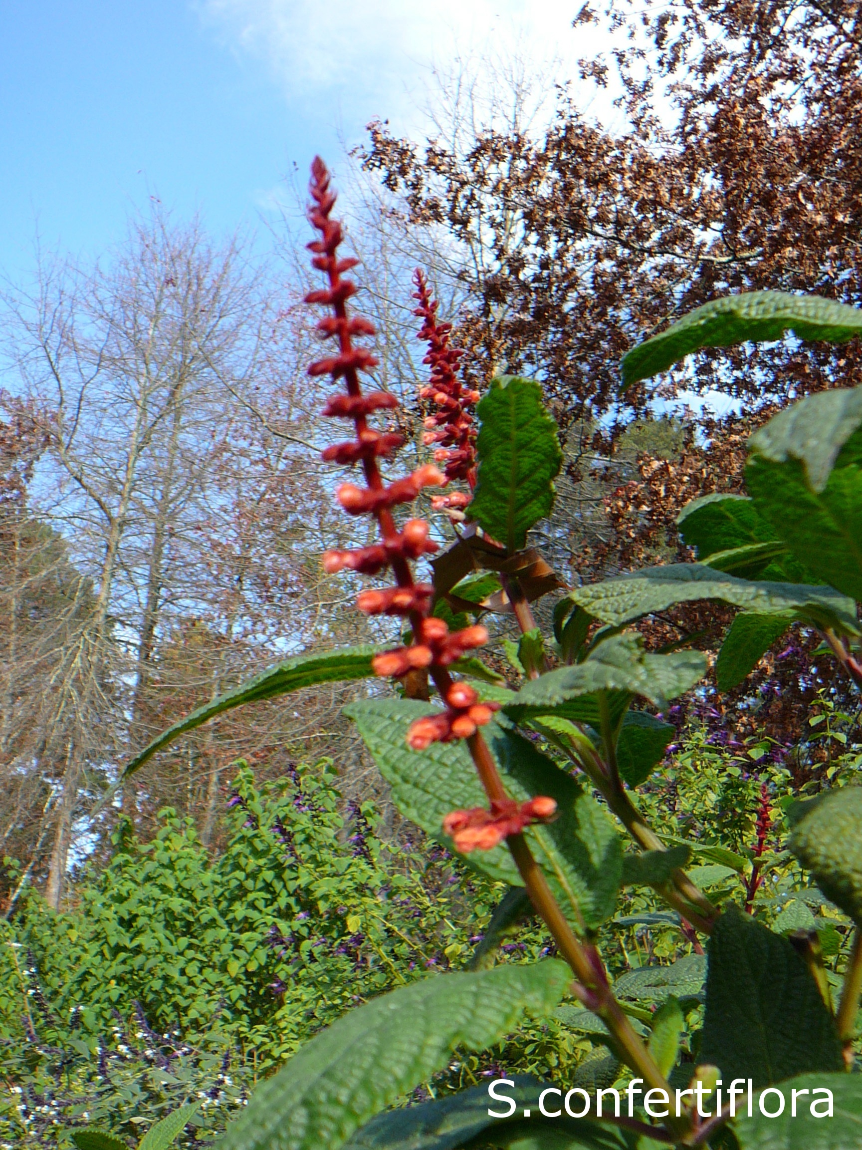 Salvia confertiflora: is a lovely upright shrub for a sunny position. Tough, hardy for summer and frost tolerant. If given good soil, it will branch out to a nice broad shrub which can be placed between other shrubs to good effect. Good drainage and not over watered should see flowers appear during the winter through to the summer months.