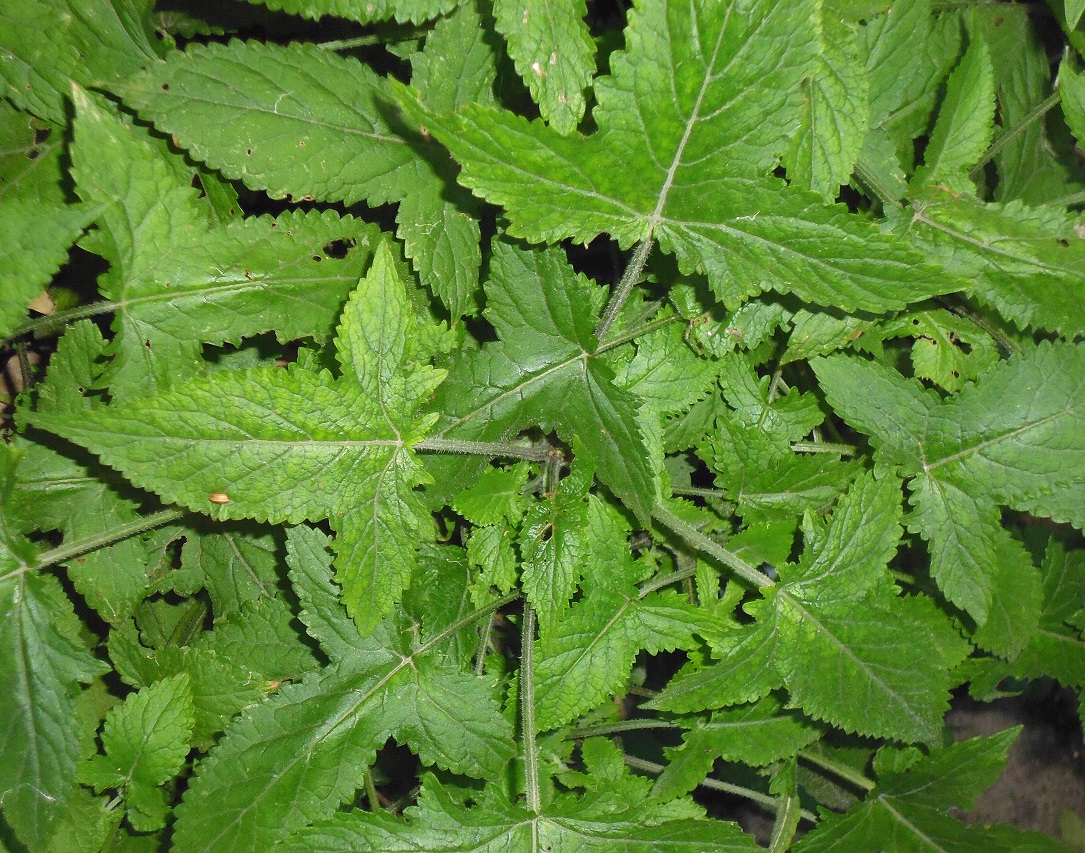 Leaves: are dark green and trilobed. Each lobe is wide, pointed tips and small crenations along the margins. Leaves are held on long green stems.