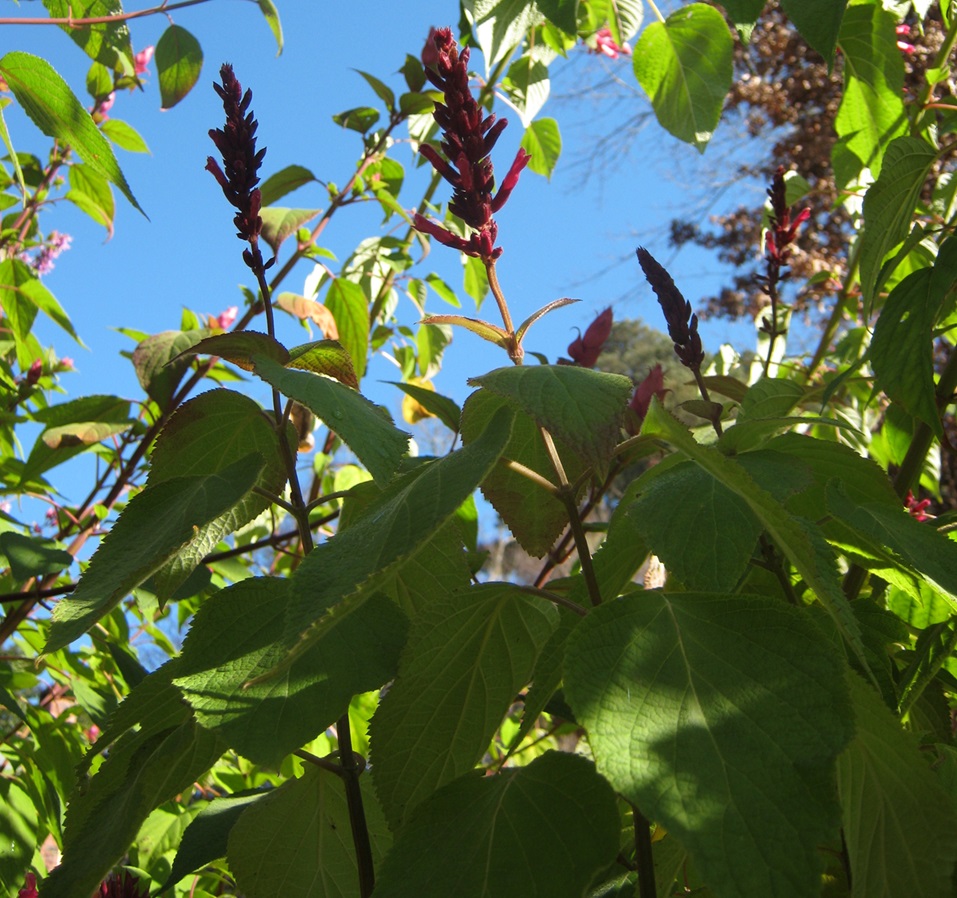Salvia curtiflora: is a tall upright shrub, 2-3mH with spires of burgundy flowers and darker calyces in winter. A shrub to grow among others at the rear of the bed for protection from frost and strong winds. Lovely dark flowers and calyces, which look stunning.The birds really e