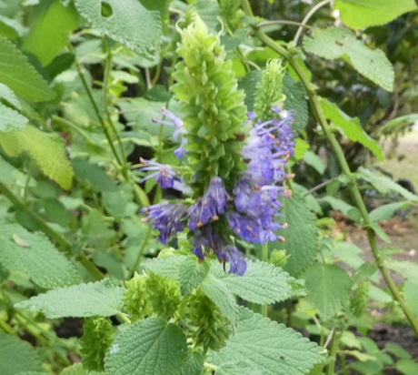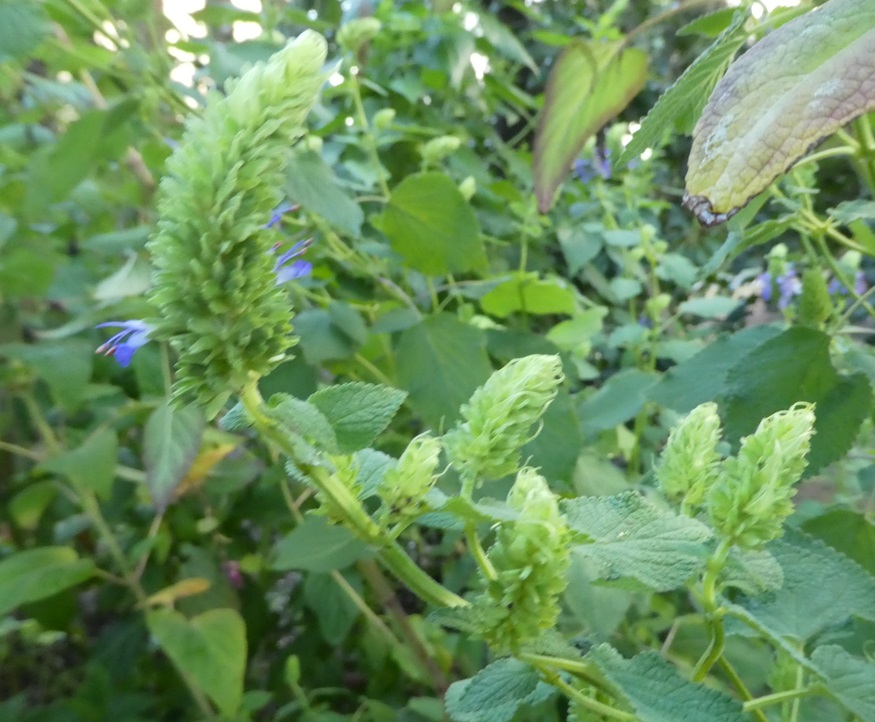 Flowers: are blue/purple, in a very dense cluster of whorls at the top of the stems. The flower head is green with the flowers beginning fairly low down and gradually opening up as they progress to the tip. The flower head forms a conical head, looking like a brush. All the heads are green, long and conical.
