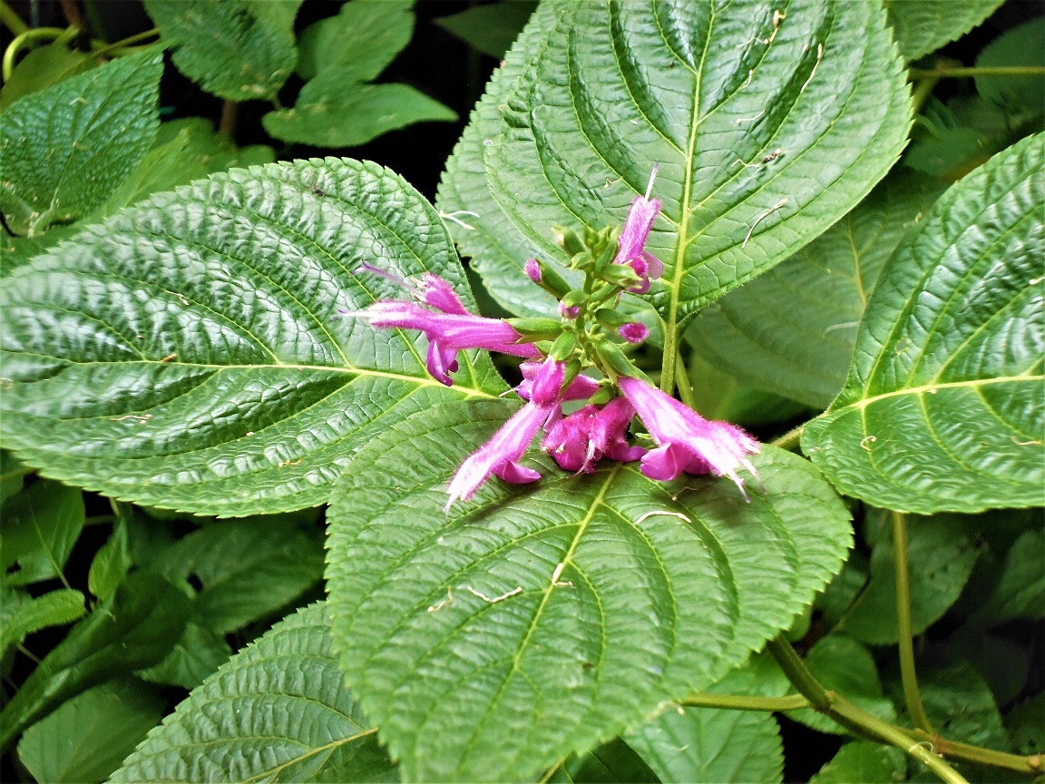Flowers: are small,semi tubular shaped,both the hood and bottom lobes are about the same size, both are cerise with the hood having lots of cerise hairs, so it looks furry.