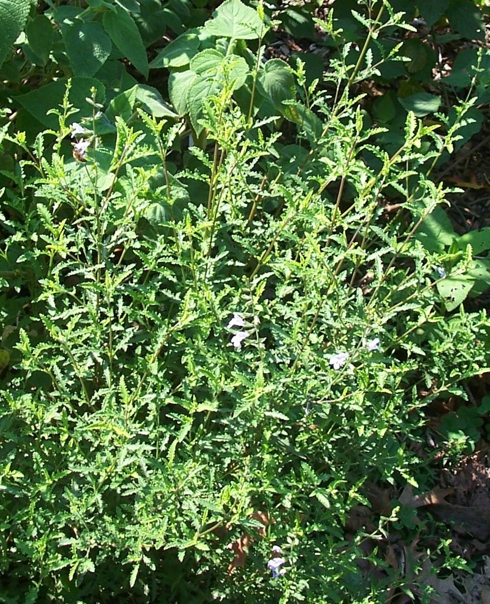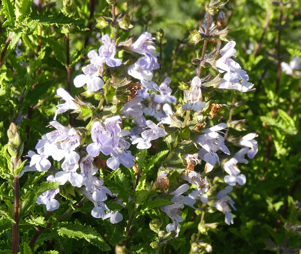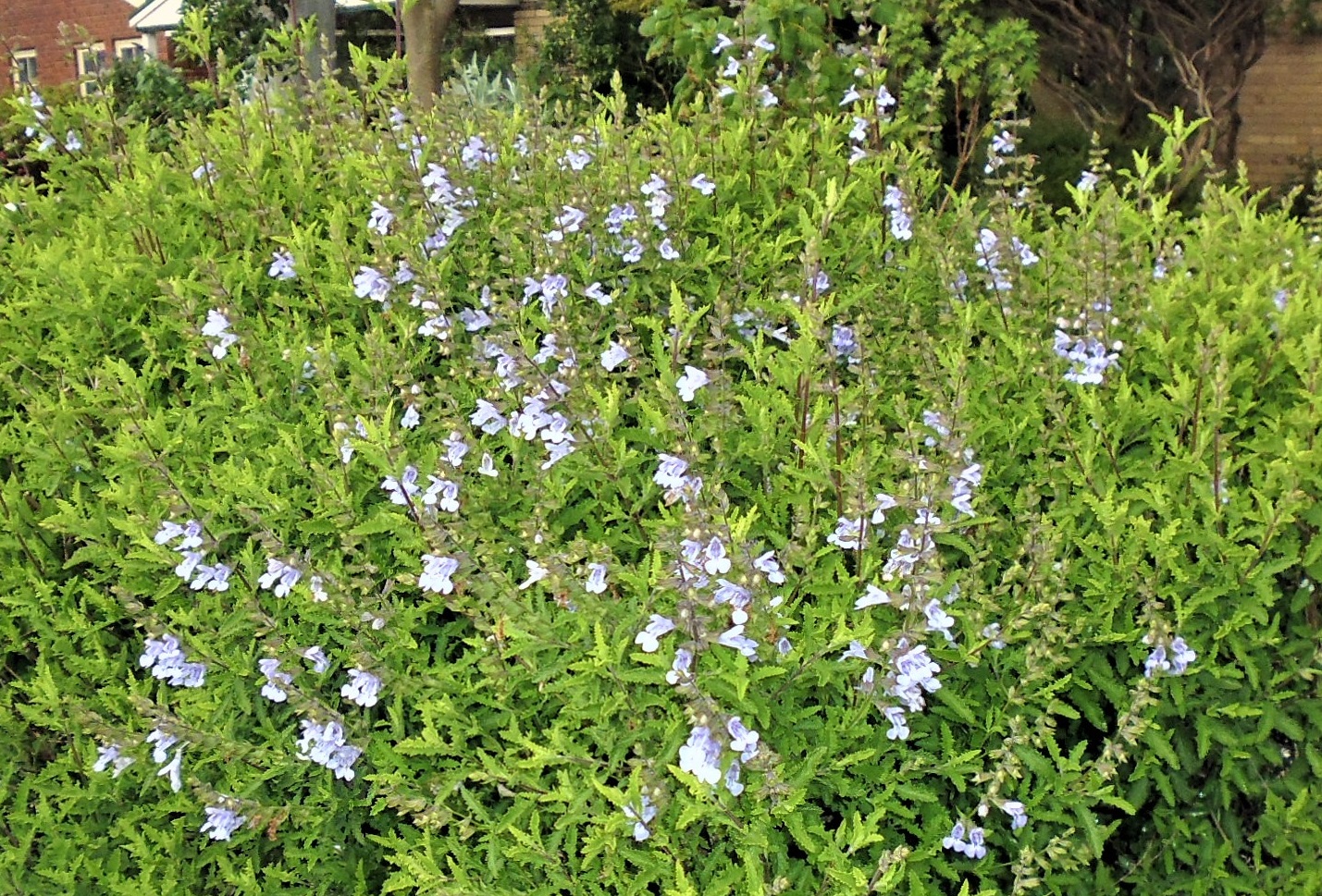 Salvia ‘Finngrove’: A dense bushy shrub 1-1.2mH with slim fragrant, lobed leaves and pale blue flowers most of year.