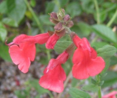 Salvia ‘Firebright’ (greggii ): A small compact shrub 40-60cmH enjoying full sun with coral red coloured flowers in spring through to autumn.