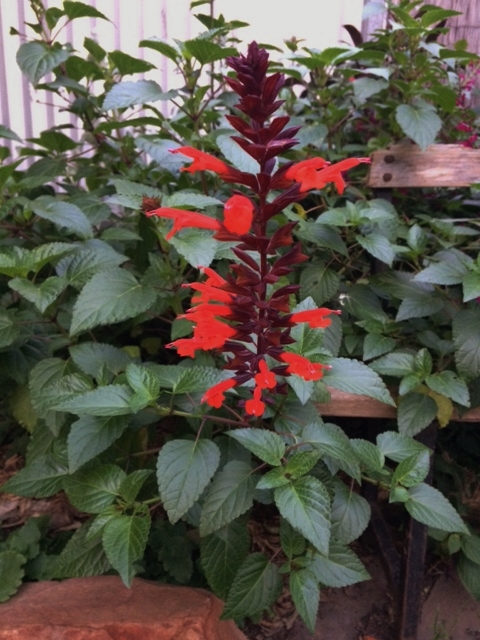 Salvia ‘Firecracker’: is an open shrub, often growing more upright. As the stems elongate quite quickly it is best supported by other plants.
