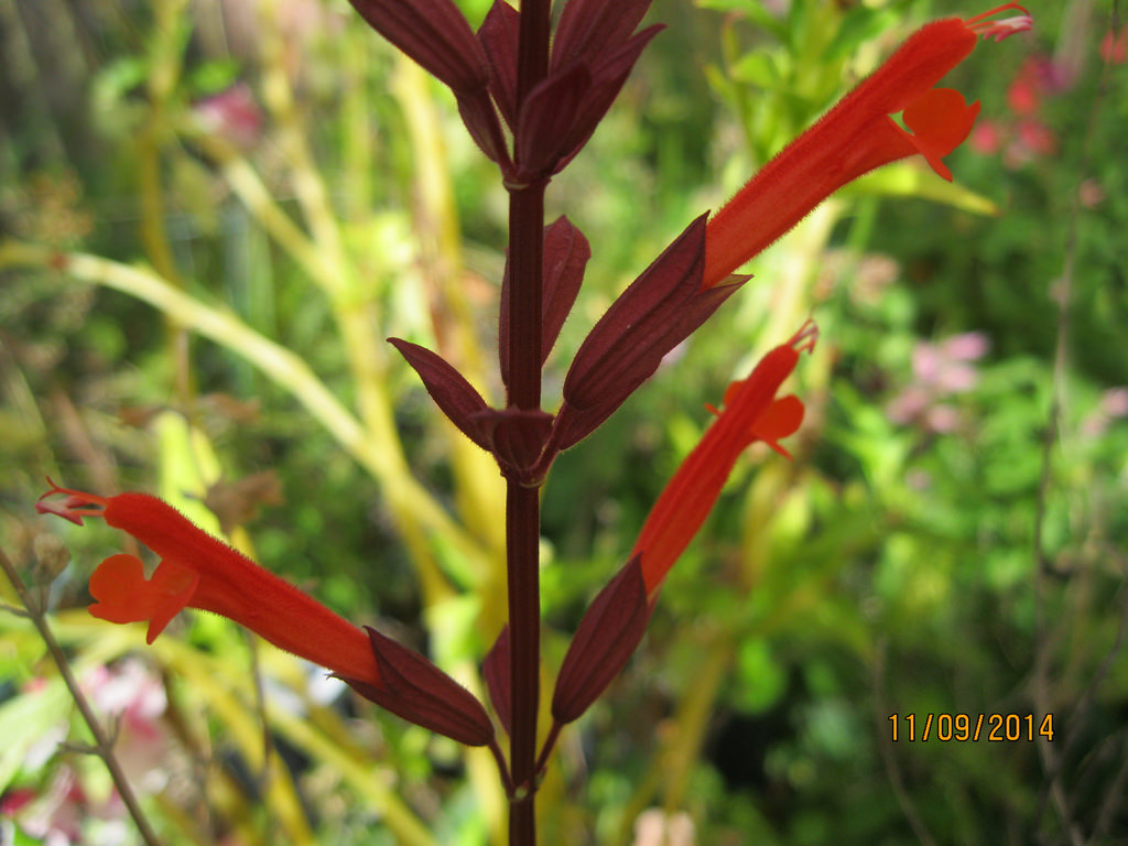 Calyces: are brown which makes the flowers seem illuminescent. Calyces are typically S.splendens shaped with distinctly ribbed pointed lobes.