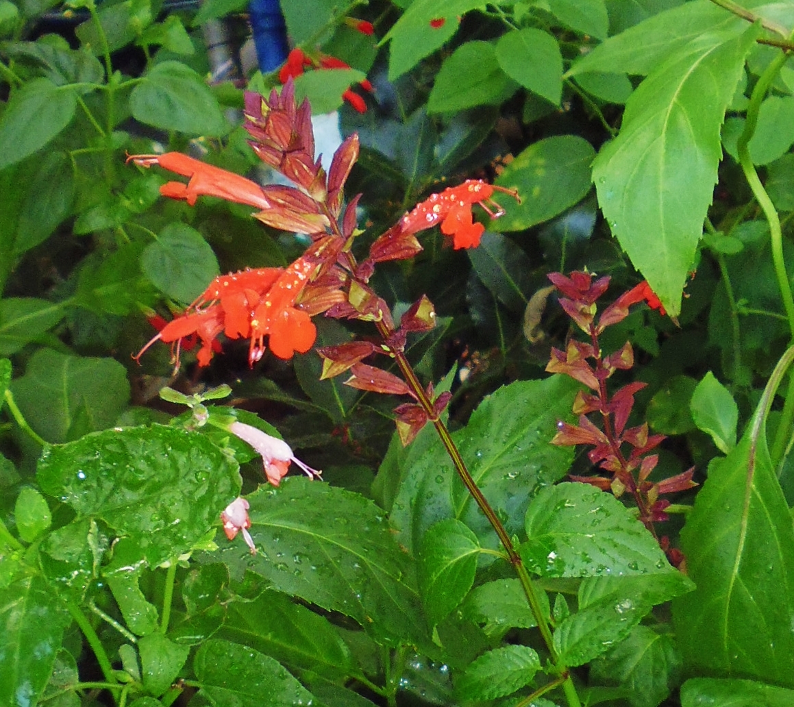 Flowers: are long tubular shaped, the whole flower is vermillion coloured. which is accentuated by a brown calyx, making the flowers seem illuminescent.