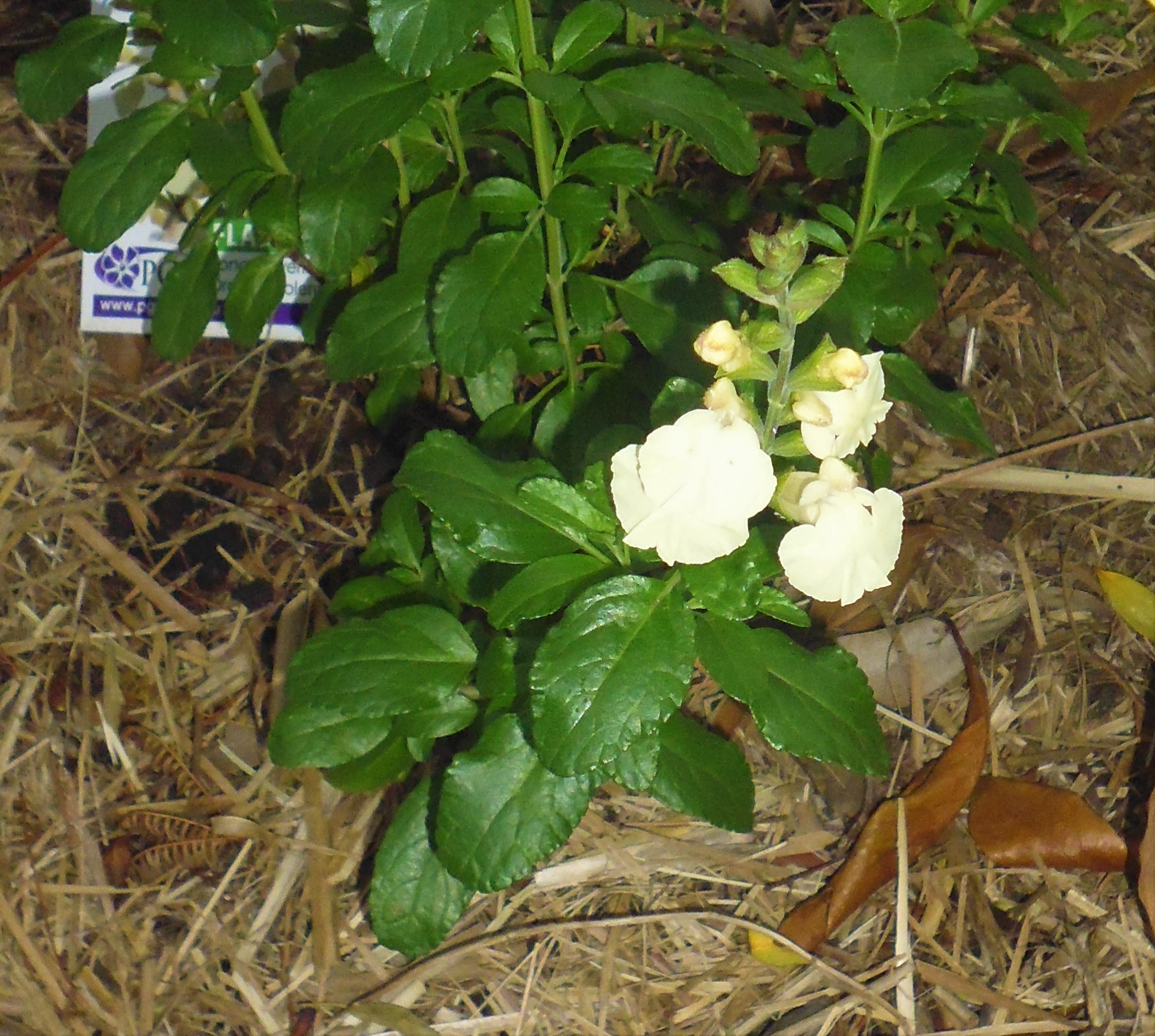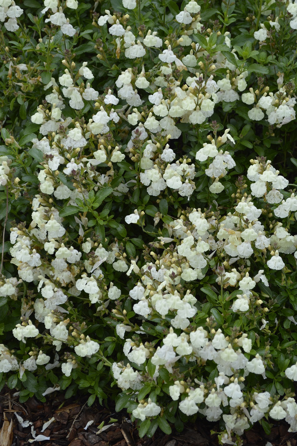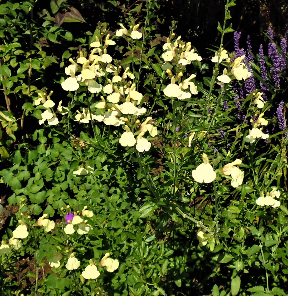 Salvia ‘Flash’ ( Heatwave): a small subshrub 40-60cmH with cream flowers in spring through to autumn for a sunny position.