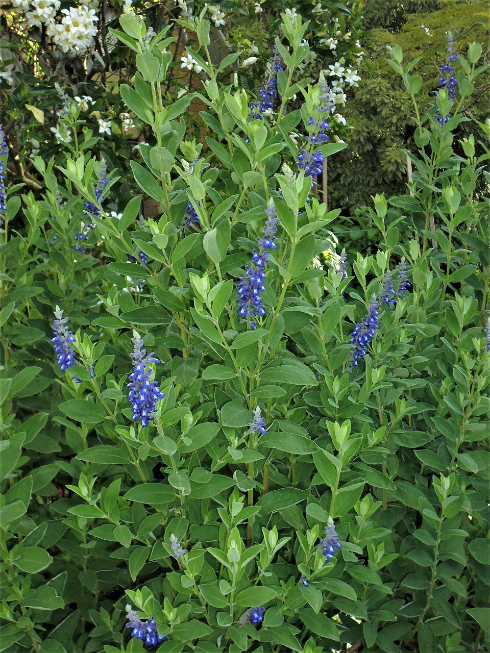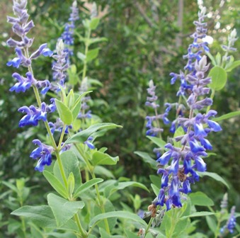 Salvia flocculosa: is a medium upright shrub 1.2mH with fragrant leaves and spires of pale blue flowers most of year.