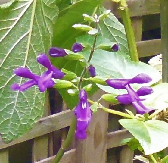 Flowers: are long, tubular, violet purple in colour with a large opening between the hood and the bottom lobes. The bottom lobes are almost the same size as the hood.