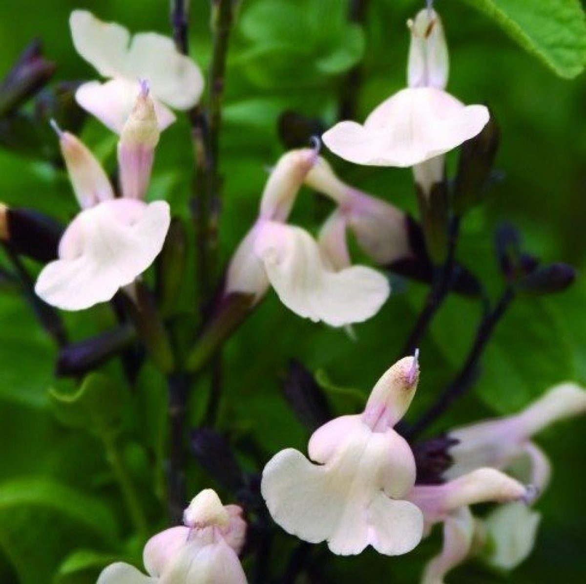 Salvia ‘Glimmer’ (Heatwave) (PBR ) ( microphylla): A microphylla type of plant, low growing bushy shrub 60cm H in full sun, with cream flowers and dark calyces.