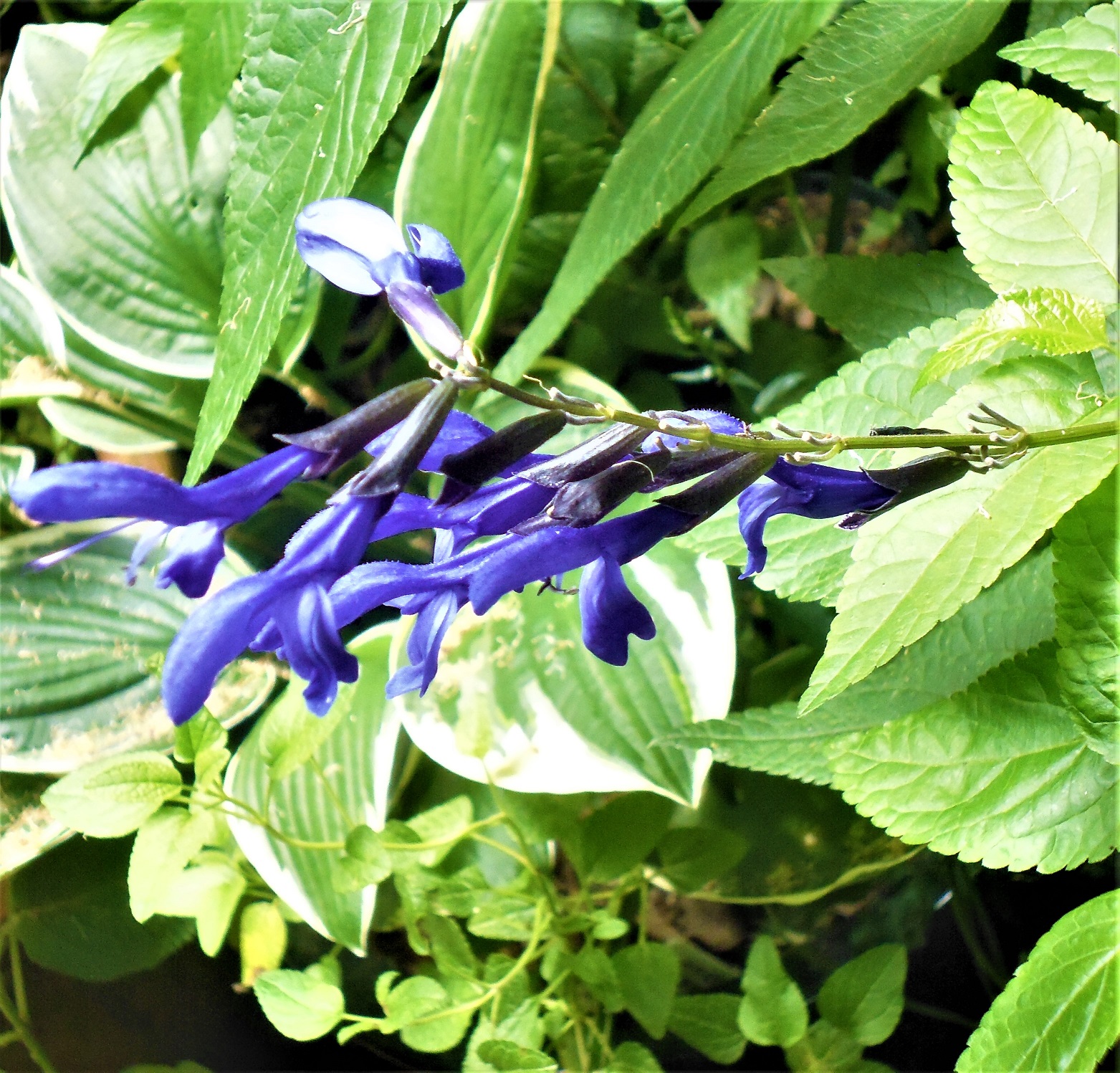Salvia guaranitica ‘Black & Blue’: is similar to it’s parent, but smaller in height, more stems being produced, so the plant seems bushy and of course the calyces being dark. The other major difference is that this plant doesn’t produce tubers but has insidious roots that seem to run every where all over the garden. So again this plant will pop up all over the garden.