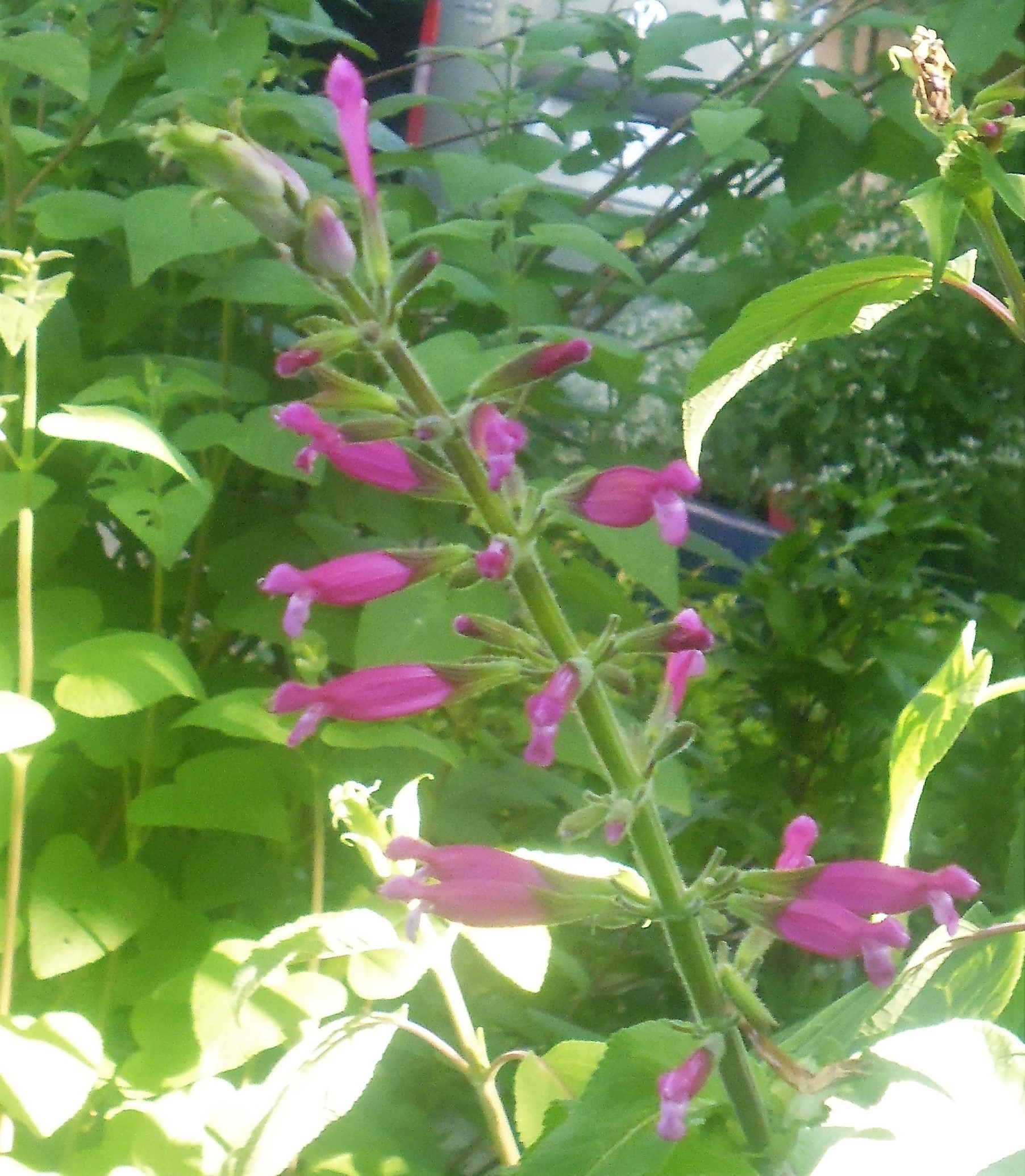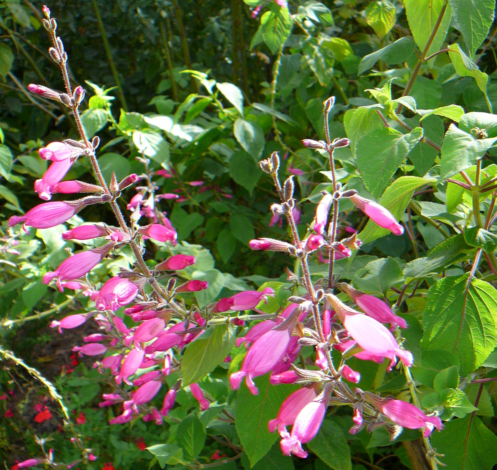 Salvia ‘Hadspen’ (involucrata): is a medium growing Salvia 1.2-1.5mH with large leaves, hollow stems and long flower heads of cerise flowers.