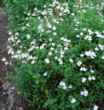 Salvia  ‘Heatwave  Glare’: is a good small tough, hardy plant for the front of the bed. Besides putting on a strong display of white flowers all summer. it also clips  well if grown as a hedge. Best grown in a sunny position in a good friable well drained soil.