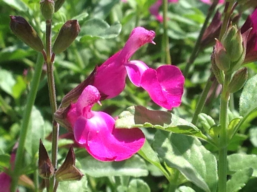 Salvia ‘Heatwave Sparkle’: is a pretty small shrub for the garden, neat and tidy, only needing trimming at the end of summer. Grow in full sun as a hedge or in an informal border with other whites, purples and blue small shrubs and perennials. This Salvia will brighten any dull corners of the garden. Bees and butterflies can be seen visiting these gorgeous vibrant pink flowers over the flowering season.