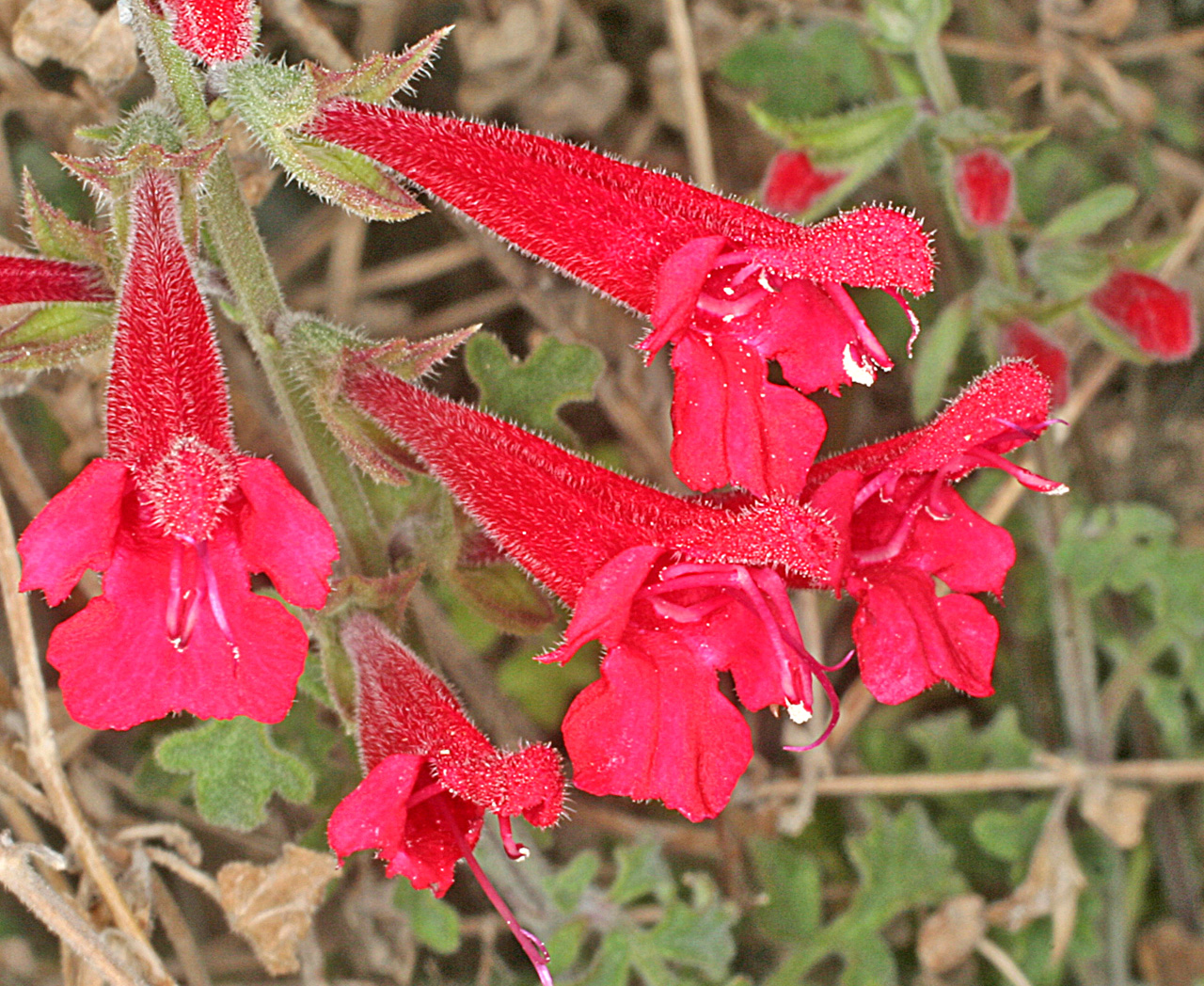 Flowers: are a bright crimson, tubular with a furry hood and all three bottom lobes opened out to embrace passing insects and small birds. The hairs over the hood and along the tube are gold tipped, the exerted stigma and stamens are crimson. Each flower is within a small whorl of 4 flowers, creating a verticillata effect along the green stem.
