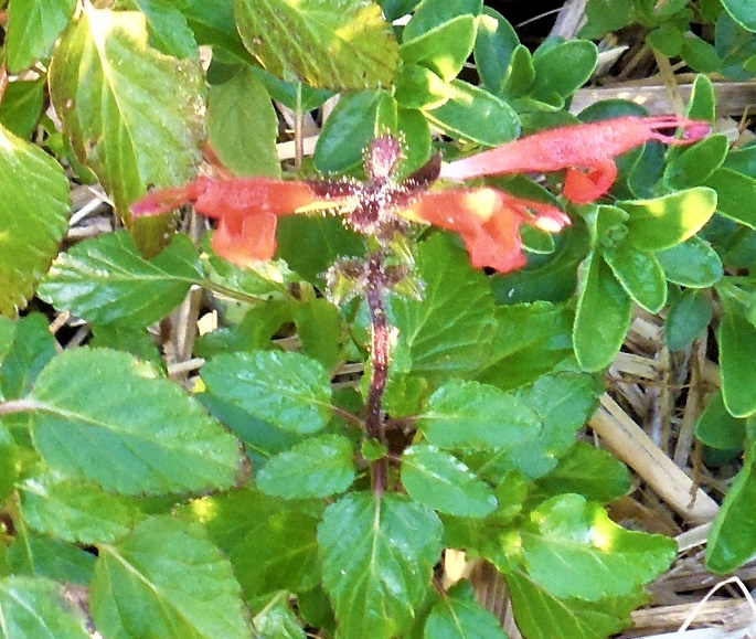 Flowers: are tubular, a red vermilion colour, grouped in verticils, along the upright flowering stem, which can reach 20 -30cmlong. The hood looks long and narrow due to the stamens and stigma being well exserted. The bottom lobes looks smaller, but is curled back to allow small birds and insects to penetrate more easily inside the corolla.