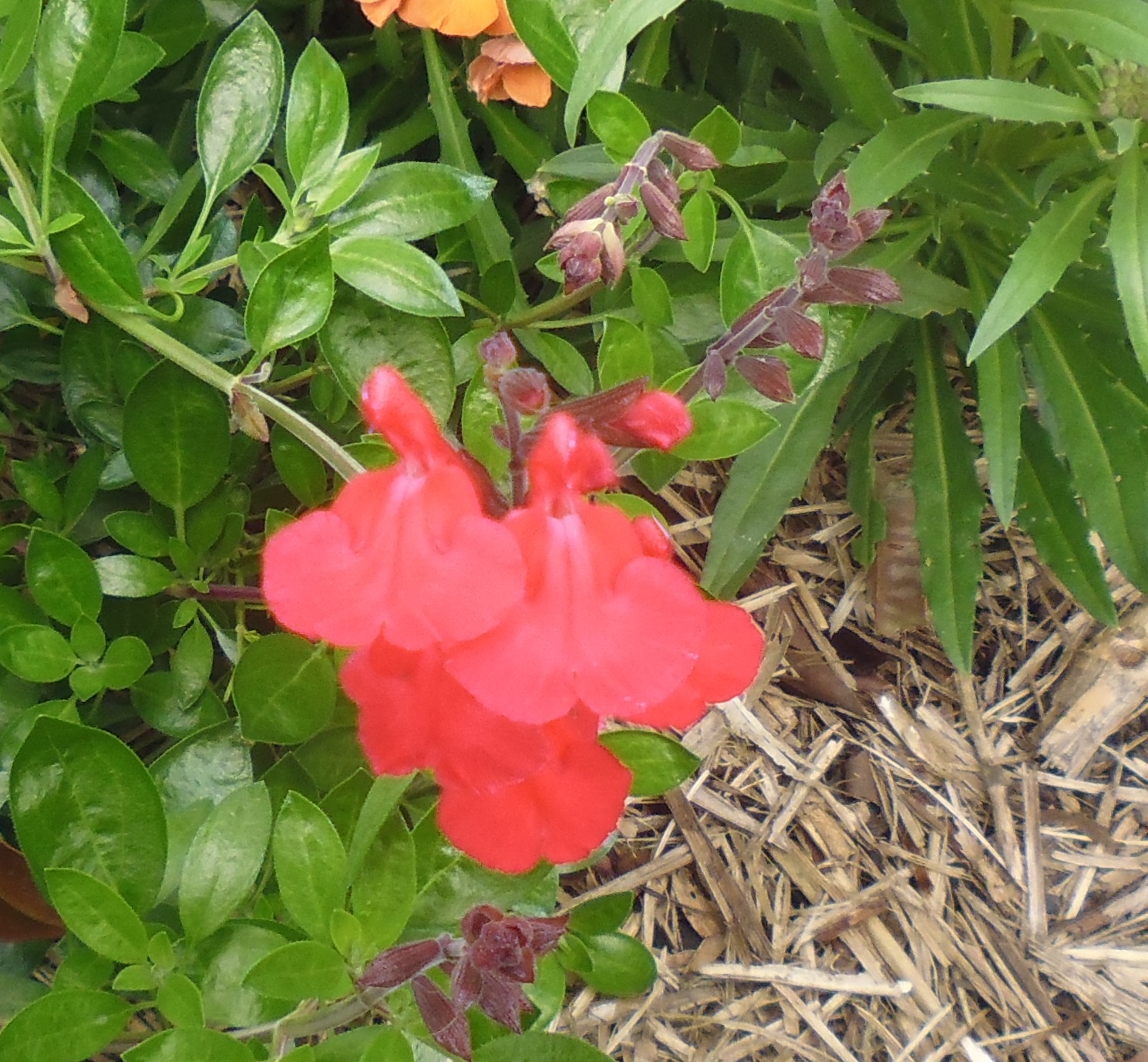 Salvia ‘Holly’ (greggii): a small compact bushy subshrub 40-60cmH for full sun with orange coral flowers and brown calyces.