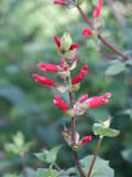 Flowers: are bright red and tubular with a small hood and lower lips, appearing in whorls of 8-12 flowers around a green stem. The whorl of flowers seem to be in two tiers, with some flowering now and some later. This is also to attract as many pollinating insects as possible.