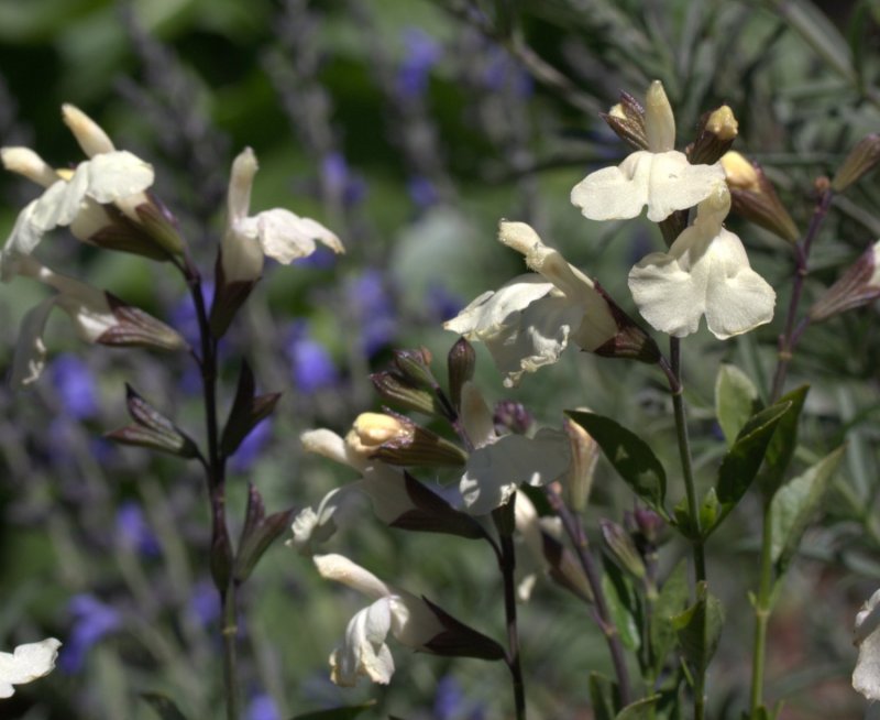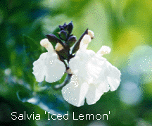 Salvia ‘Iced Lemon’ (microphylla): is a small subshrub for a sunny position, 40-60cmH with pale lemon flowers and very dark calyces.