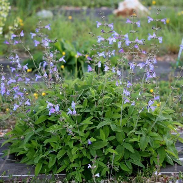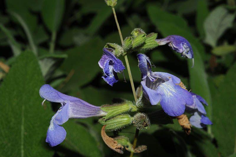 Salvia interrupta: is a small perennial shrub with a woody base 10-20cmH. Hairy trifoliate leaves and large blue / mauve flowers in summer.