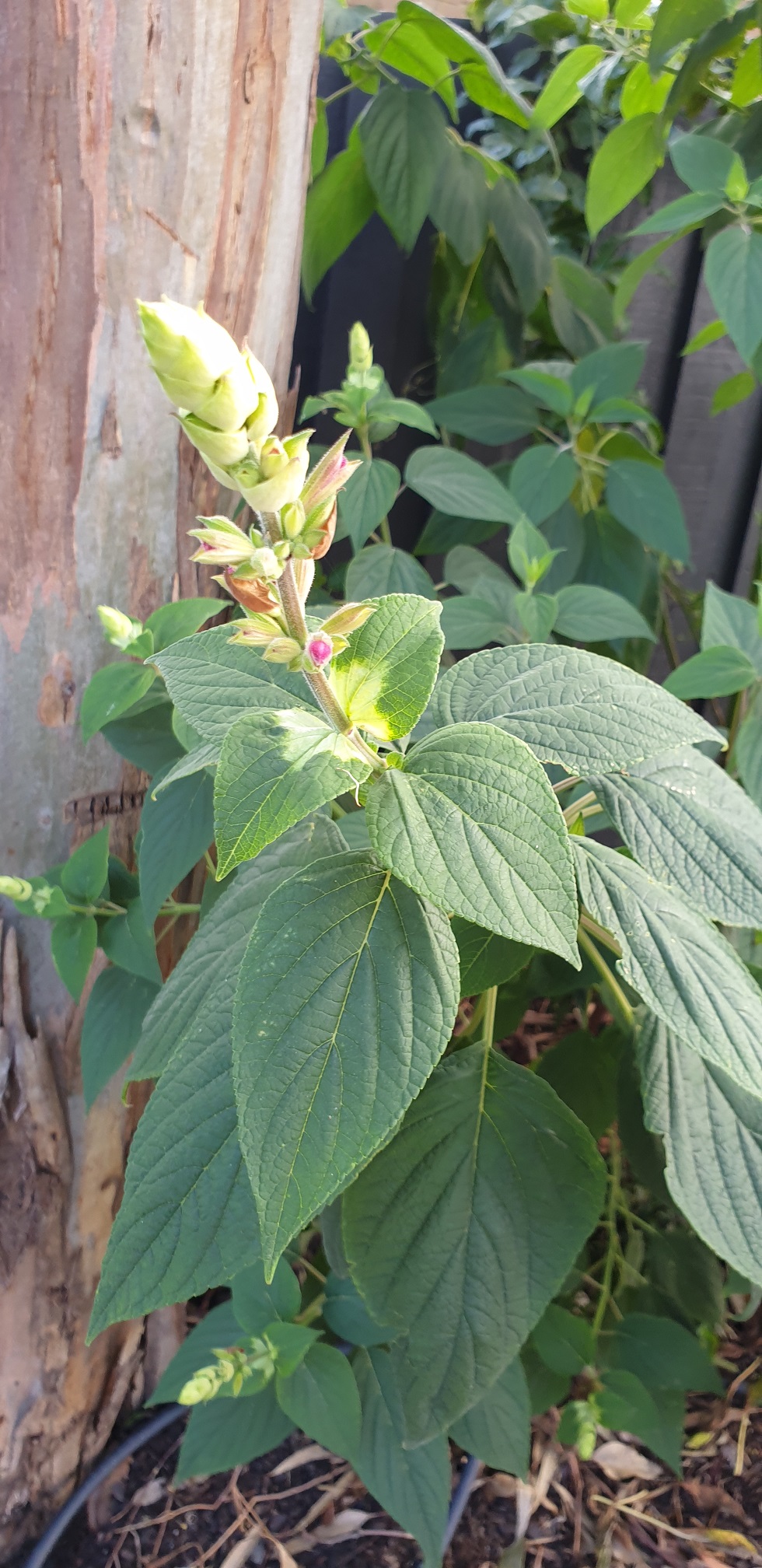 All involucrata hybrids have an involucrote, some large, some only very small. An involucrote is a knob of bracts ( usually the same colour as the corollas) full of more flowers. Salvia ‘Pink Gruyere’ has a very small green rounded knob. The small bracts fall off as each whorl of flowers opens.